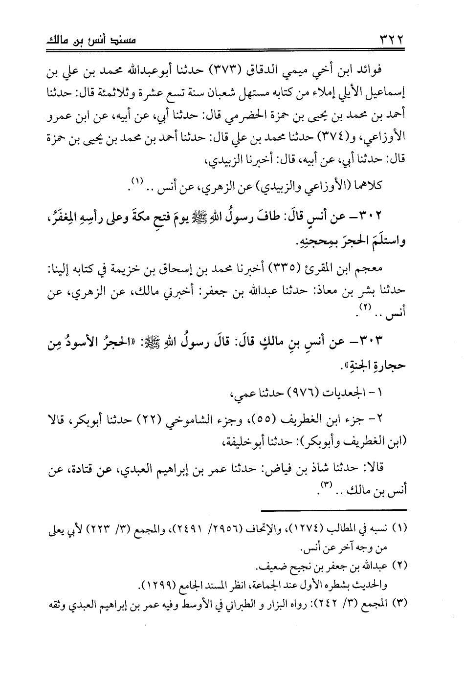 فوائد ابن أخي ميمي الدقاق (373) حدثنا أبوعبدالله محمد بن علي بن إسماعيل الأيلي إملاء من كتابه مستهل شعبان سنة تسع عشرة وثلاثمئة قال: حدثنا أحمد بن محمد بن يحيى بن حمزة الحضرمي قال: حدثنا أبي، عن أبيه، عن ابن عمرو الأوزاعي، و (374) حدثنا محمد بن علي قال: حدثنا أحمد بن محمد بن يحيى بن حمزة قال: حدثنا أبي، عن أبيه، قال: أخبرنا الزبيدي،