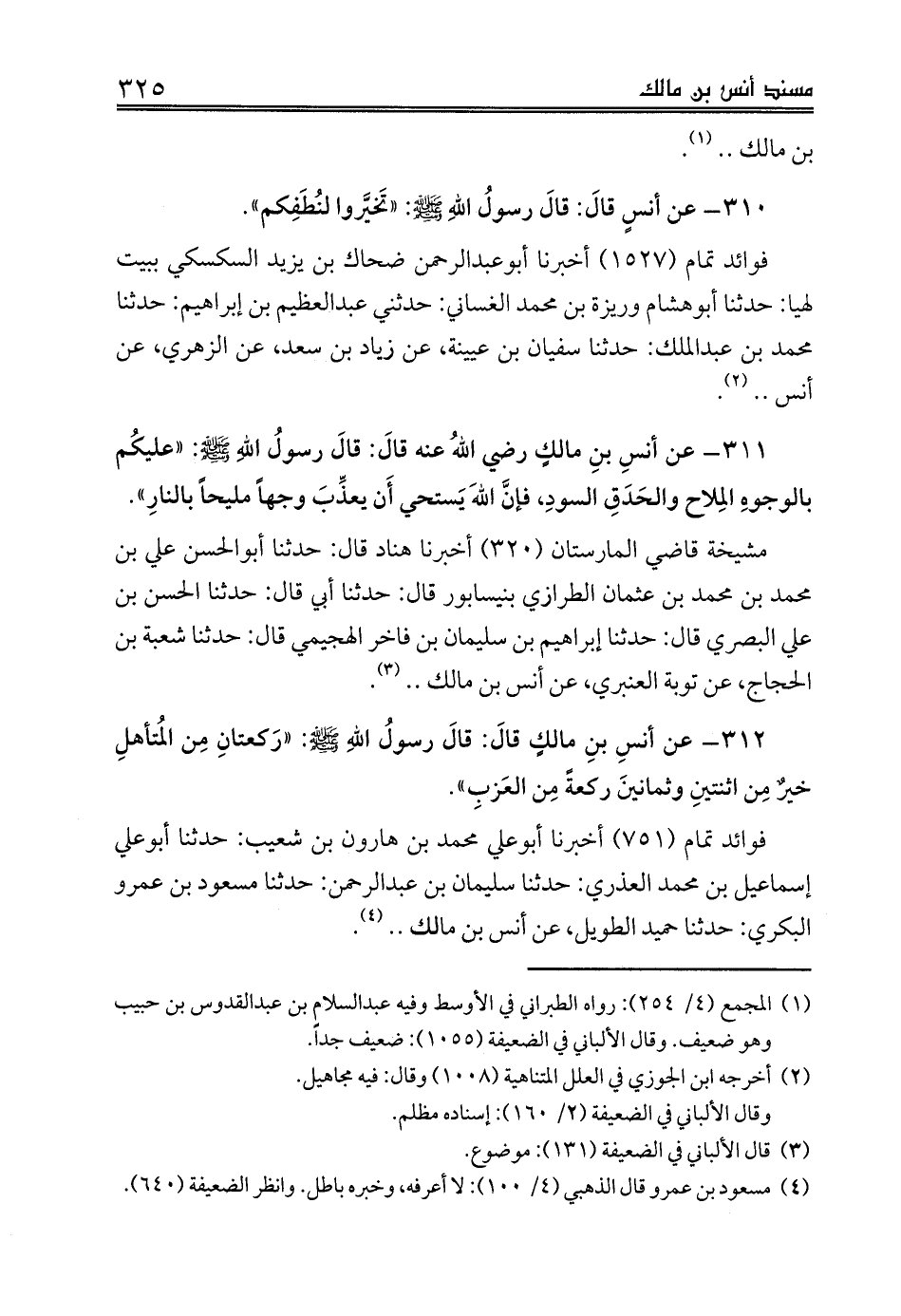 فوائد تمام (751) أخبرنا أبوعلي محمد بن هارون بن شعيب: حدثنا أبوعلي إسماعيل بن محمد العذري: حدثنا سليمان بن عبدالرحمن: حدثنا مسعود بن عمرو البكري: حدثنا حميد الطويل، عن أنس بن مالك .. (¬4).