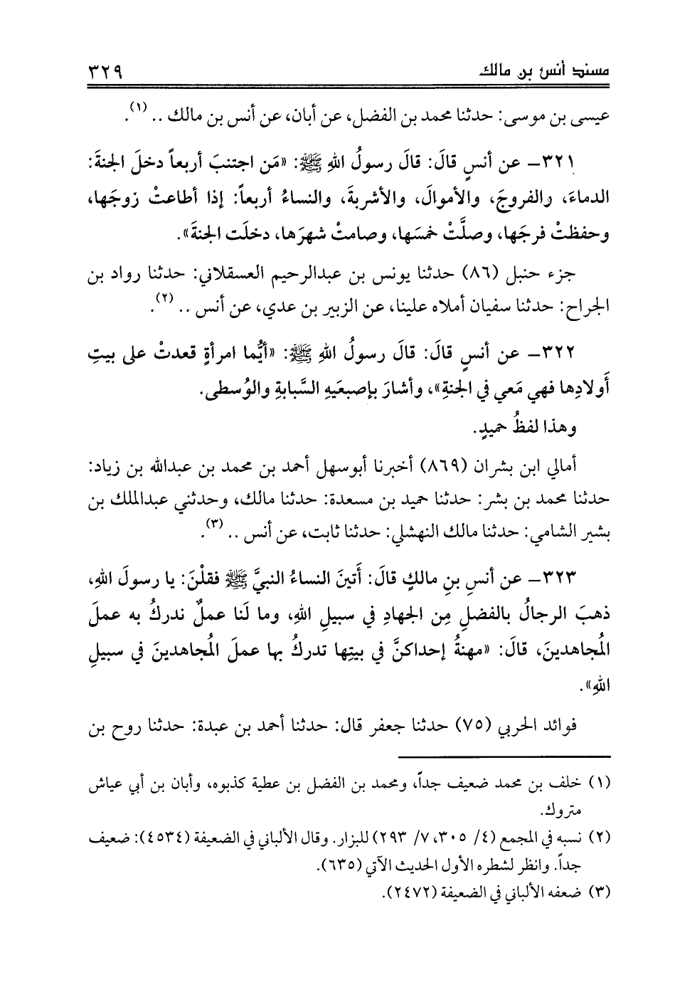 323 - عن أنسِ بنِ مالكٍ قالَ: أَتينَ النساءُ النبيَّ صلى الله عليه وسلم فقلْنَ: يا رسولَ اللهِ، ذهبَ الرجالُ بالفضلِ مِن الجهادِ في سبيلِ اللهِ، وما لَنا عملٌ ندركُ به عملَ المُجاهدينَ، قالَ: «مهنةُ إحداكنَّ في بيتِها تدركُ بها عملَ المُجاهدينَ في سبيلِ اللهِ».