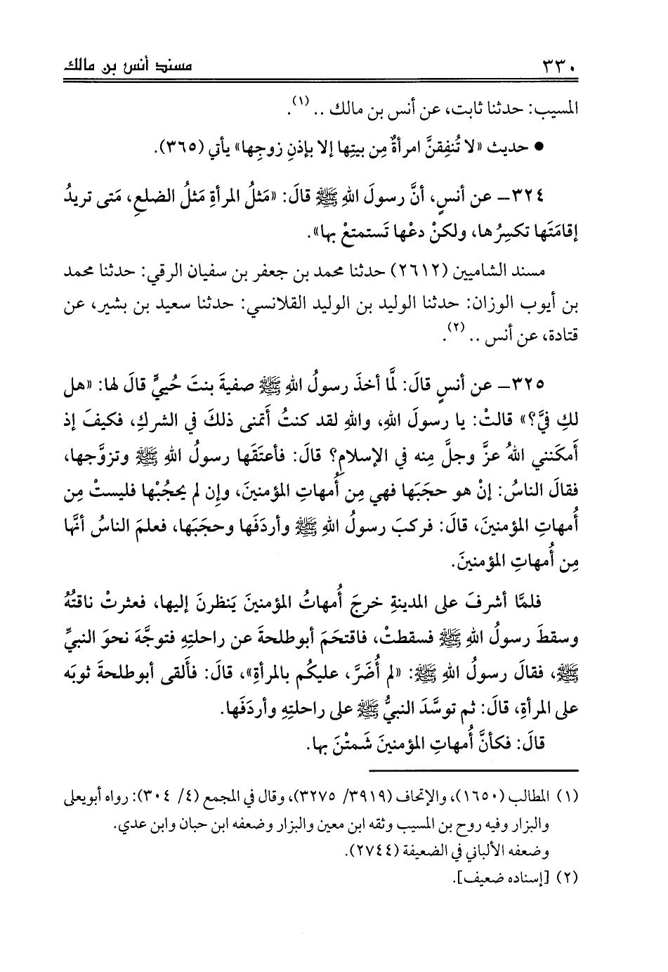 325 - عن أنسٍ قالَ: لمَّا أخذَ رسولُ اللهِ صلى الله عليه وسلم صفيةَ بنتَ حُييٍّ قالَ لها: «هل لكِ فيَّ؟» قالتْ: يا رسولَ اللهِ، واللهِ لقد كنتُ أَتمنى ذلكَ في الشركِ، فكيفَ إذ أَمكَنني اللهُ عزَّ وجلَّ مِنه في الإسلامِ؟ قالَ: فأعتَقَها رسولُ اللهِ صلى الله عليه وسلم وتزوَّجها، فقالَ الناسُ: إنْ هو حجَبَها فهي مِن أُمهاتِ المؤمنينَ، وإِن لم يحجُبْها فليستْ مِن أُمهاتِ المؤمنينَ، قالَ: فركبَ رسولُ اللهِ صلى الله عليه وسلم وأردَفَها وحجَبَها، فعلمَ الناسُ أنَّها مِن أُمهاتِ المؤمنينَ.