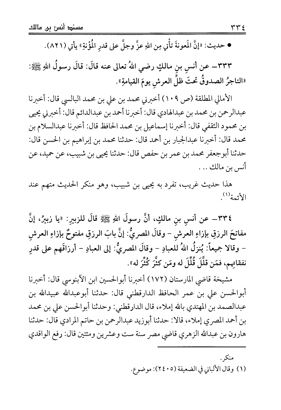 334 - عن أنسِ بنِ مالكٍ، أنَّ رسولَ اللهِ صلى الله عليه وسلم قالَ للزبيرِ: «يا زبيرُ، إنَّ مفاتحَ الرزقِ بإزاءِ العرشِ - وقالَ المصريُّ: إنَّ بابَ الرزقِ مفتوحٌ بإزاءِ العرشِ - وقالا جميعاً: يُنزلُ اللهُ للعبادِ - وقالَ المصريُّ: إلى العبادِ - أرزاقَهم على قدرِ نفقاتِهم، فمَن قلَّلَ قُلِّلَ له ومَن كثَّرَ كُثِّرَ له».