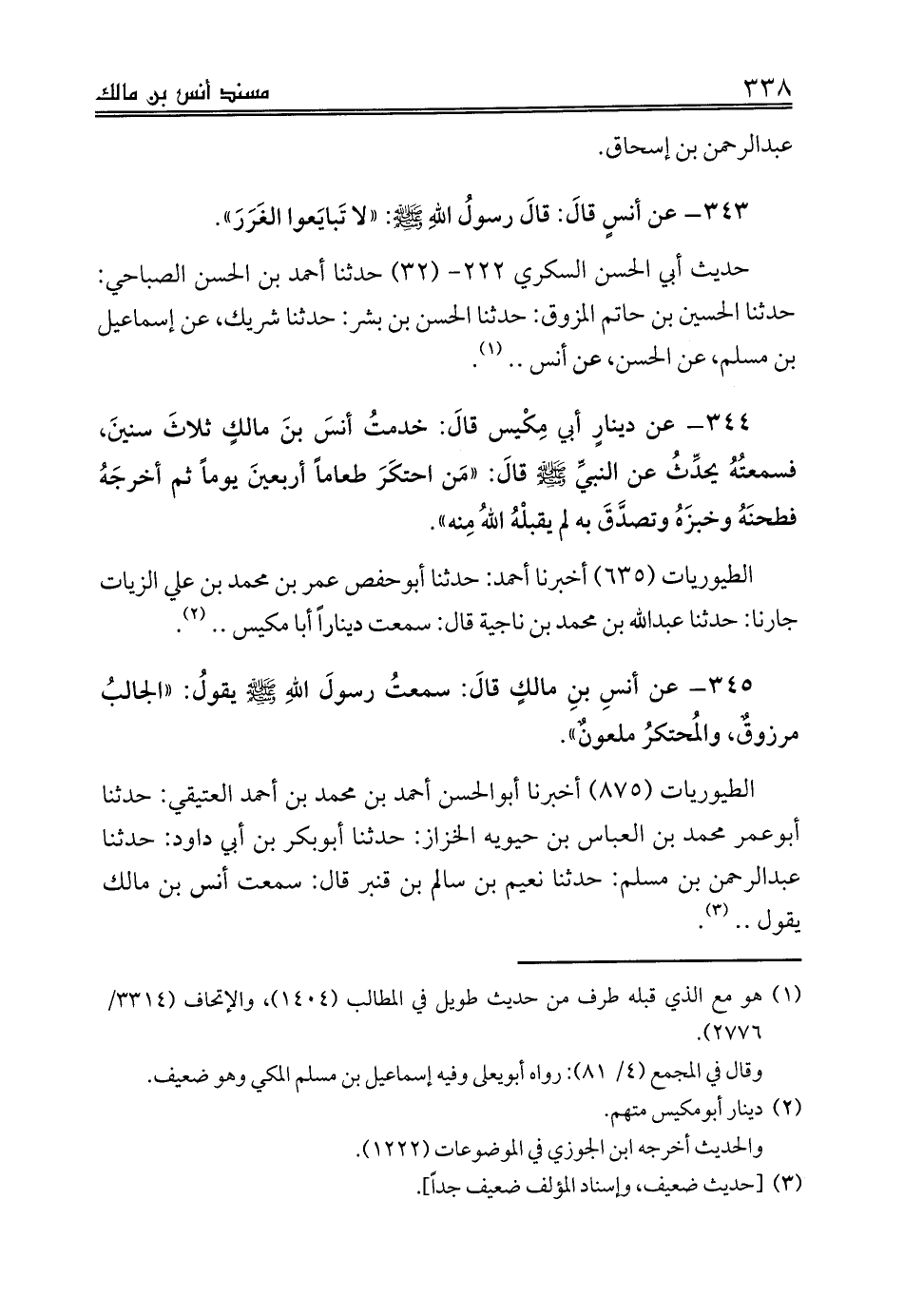 343 - عن أنسٍ قالَ: قالَ رسولُ اللهِ صلى الله عليه وسلم: «لا تَبايَعوا الغَرَرَ».