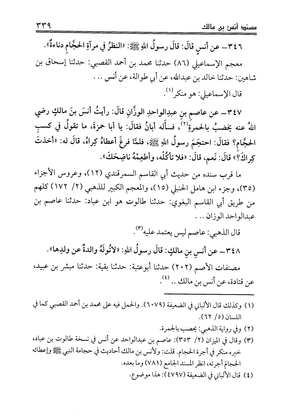346 - عن أنسٍ قالَ: قالَ رسولُ اللهِ صلى الله عليه وسلم: «النظرُ في مرآةِ الحجَّامِ دناءةٌ».