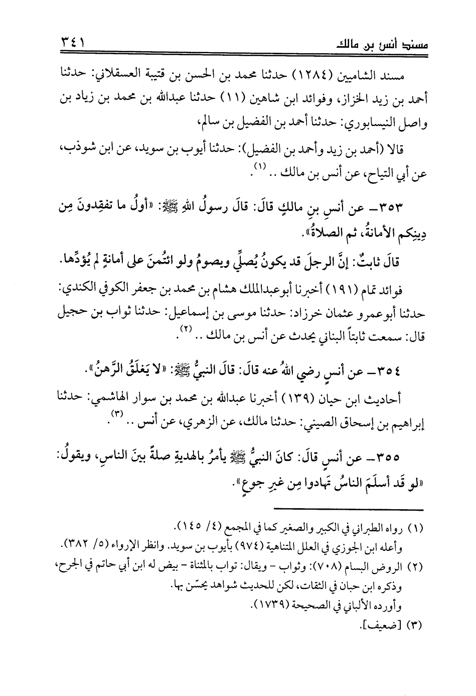 قالا (أحمد بن زيد وأحمد بن الفضيل): حدثنا أيوب بن سويد، عن ابن شوذب، عن أبي التياح، عن أنس بن مالك .. (¬1).