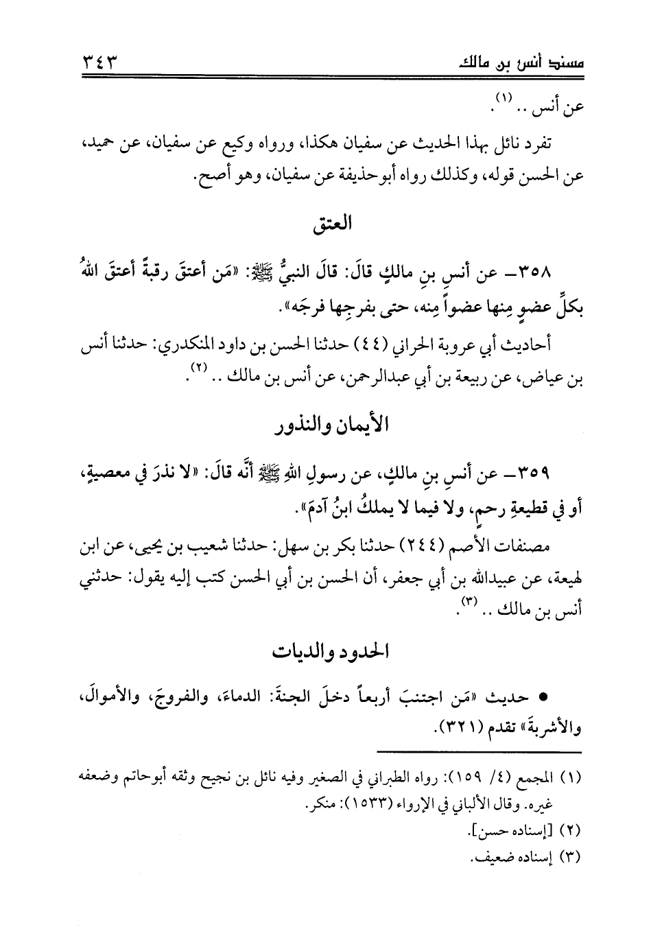 359 - عن أنسِ بنِ مالكٍ، عن رسولِ اللهِ صلى الله عليه وسلم أنَّه قالَ: «لا نذرَ في معصيةٍ، أوفي قطيعةِ رحمٍ، ولا فيما لا يملكُ ابنُ آدمَ».