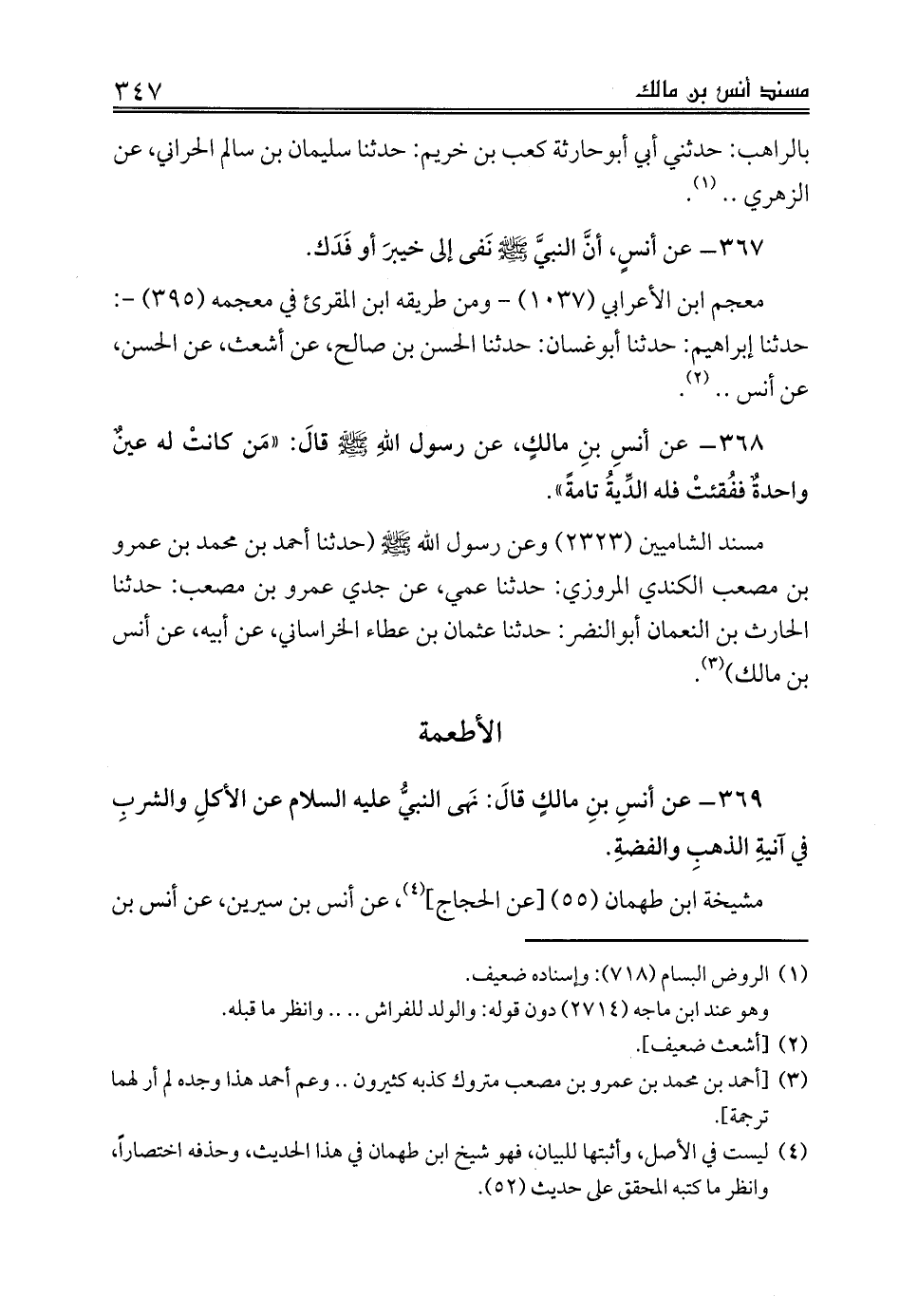 369 - عن أنسِ بنِ مالكٍ قالَ: نَهى النبيُّ عليه السلام عن الأكلِ والشربِ في آنيةِ الذهبِ والفضةِ.