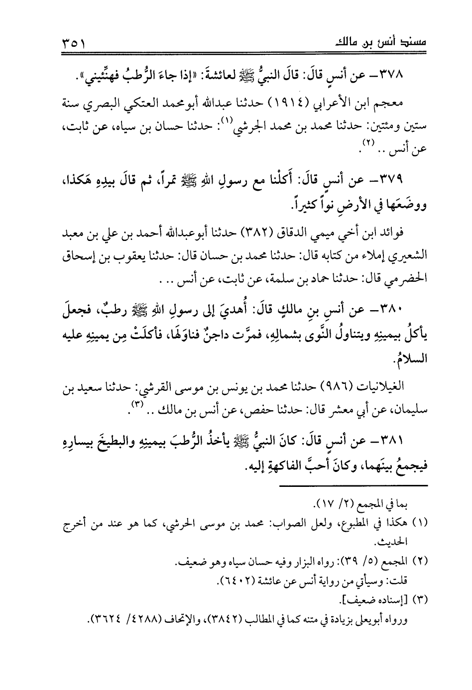 381 - عن أنسٍ قالَ: كانَ النبيُّ صلى الله عليه وسلم يأخذُ الرُّطبَ بيمينِهِ والبطيخَ بيسارِهِ فيجمعُ بينَهما، وكانَ أحبَّ الفاكهةِ إليه.
