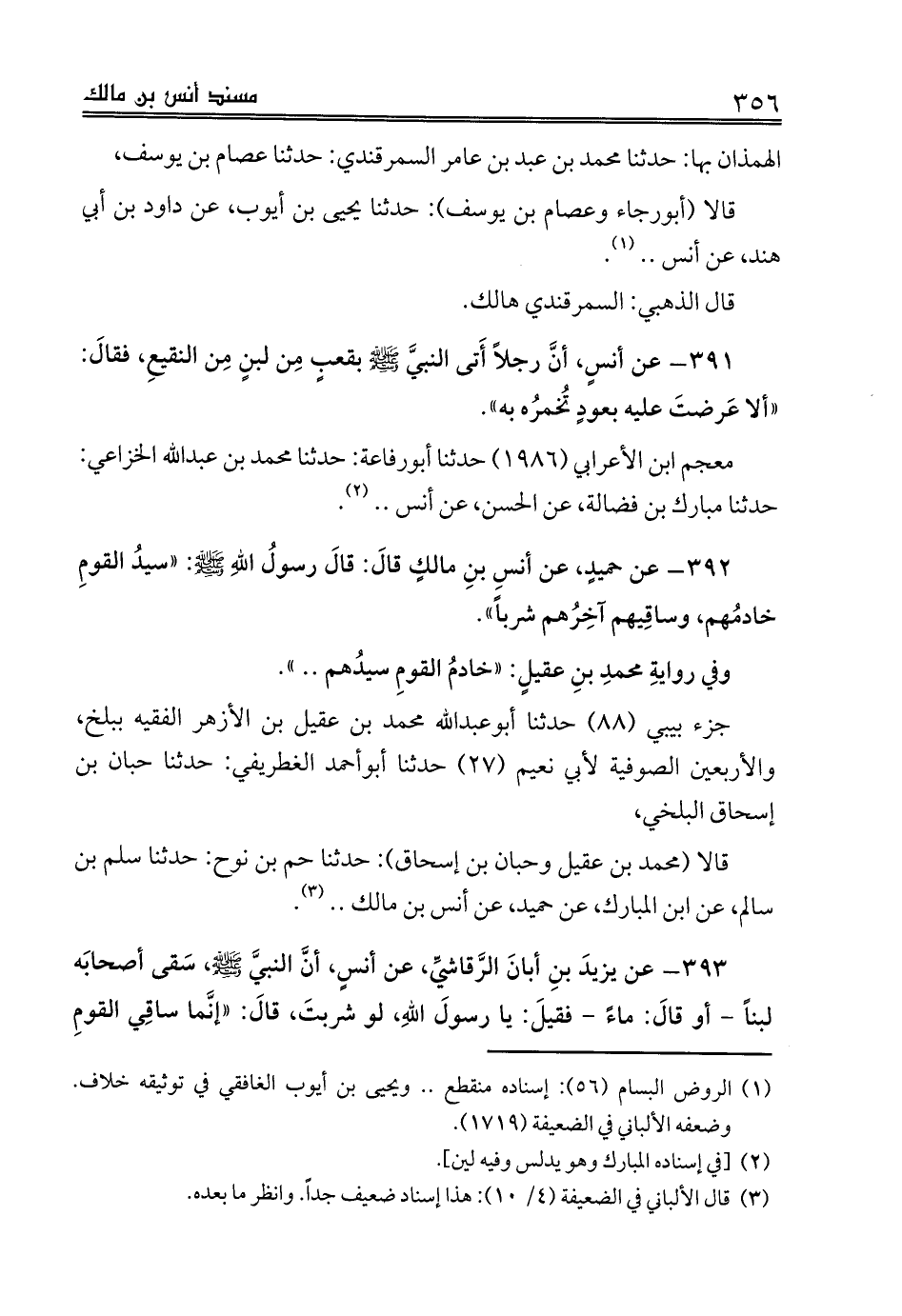 393 - عن يزيدَ بنِ أبانَ الرَّقاشيِّ، عن أنسٍ، أنَّ النبيَّ صلى الله عليه وسلم، سَقى أصحابَه لبناً - أو قالَ: ماءً- فقيلَ: يا رسولَ اللهِ، لو شربتَ، قالَ: «إنَّما ساقِي القومِ