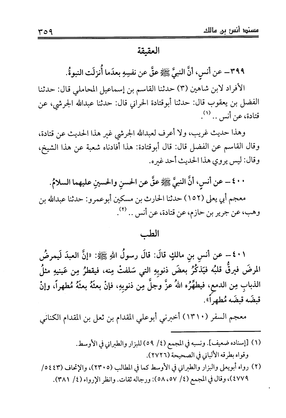 399 - عن أنسٍ، أنَّ النبيَّ صلى الله عليه وسلم عقَّ عن نفسِهِ بعدَما أُنزلَت النبوةُ.