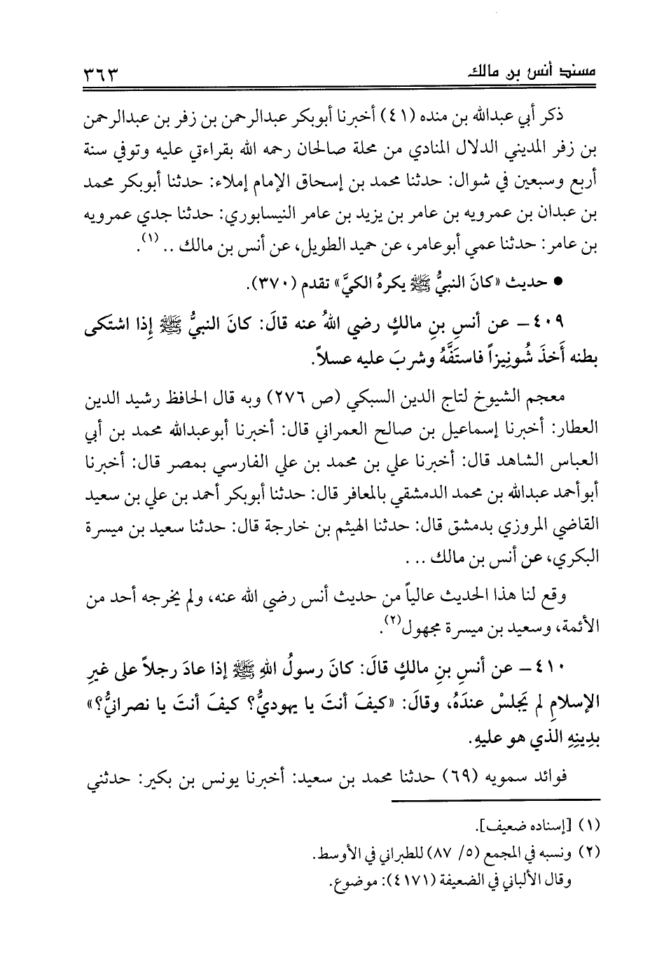ذكر أبي عبدالله بن منده (41) أخبرنا أبوبكر عبدالرحمن بن زفر بن عبدالرحمن بن زفر المديني الدلال المنادي من محلة صالحان رحمه الله بقراءتي عليه وتوفي سنة أربع وسبعين في شوال: حدثنا محمد بن إسحاق الإمام إملاء: حدثنا أبوبكر محمد بن عبدان بن عمرويه بن عامر بن يزيد بن عامر النيسابوري: حدثنا جدي عمرويه بن عامر: حدثنا عمي أبوعامر، عن حميد الطويل، عن أنس بن مالك .. (¬1).