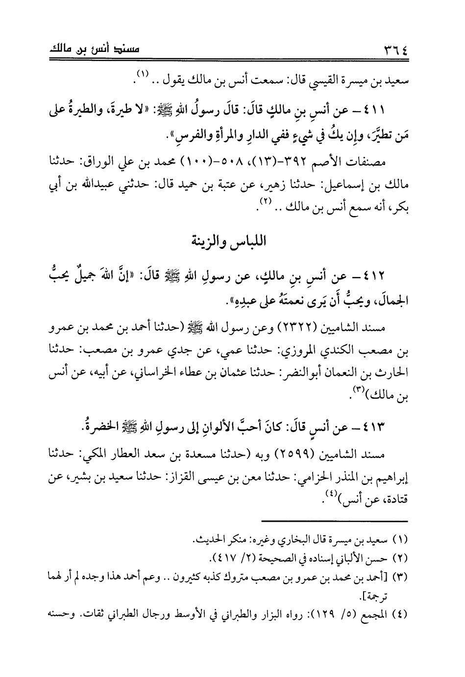 412 - عن أنسِ بنِ مالكٍ، عن رسولِ اللهِ صلى الله عليه وسلم قالَ: «إنَّ اللهَ جميلٌ يحبُّ الجمالَ، ويحبُّ أَن يَرى نعمتَهُ على عبدِهِ».