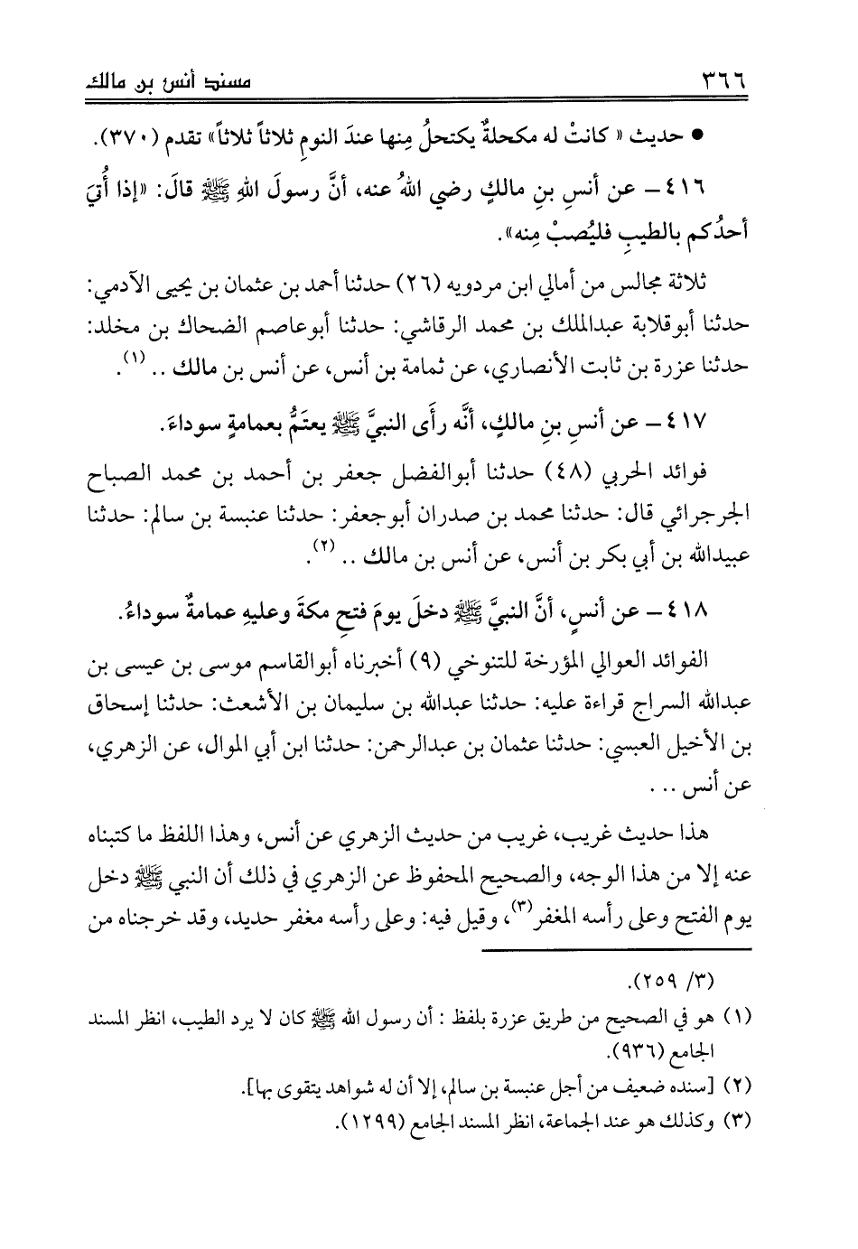 الفوائد العوالي المؤرخة للتنوخي (9) أخبرناه أبوالقاسم موسى بن عيسى بن عبدالله السراج قراءة عليه: حدثنا عبدالله بن سليمان بن الأشعث: حدثنا إسحاق بن الأخيل العبسي: حدثنا عثمان بن عبدالرحمن: حدثنا ابن أبي الموال، عن الزهري، عن أنس .. .