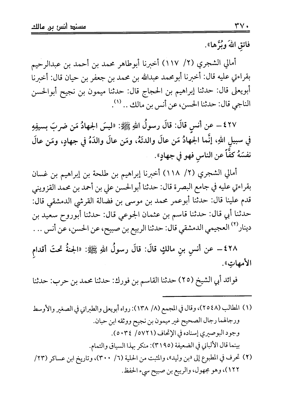 428 - عن أنسِ بنِ مالكٍ قالَ: قالَ رسولُ اللهِ صلى الله عليه وسلم: «الجنةُ تحتَ أقدامِ الأمهاتِ».