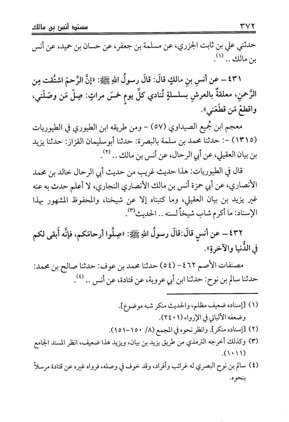 431 - عن أنسِ بنِ مالكٍ قالَ: قالَ رسولُ اللهِ صلى الله عليه وسلم: «إنَّ الرَّحمَ اشتُقت مِن الرَّحمنِ، معلقةٌ بالعرشِ بسلسلةٍ تُنادي كلَّ يومٍ خمسَ مراتٍ: صِلْ مَن وصَلَني، واقطعْ مَن قطَعَني».