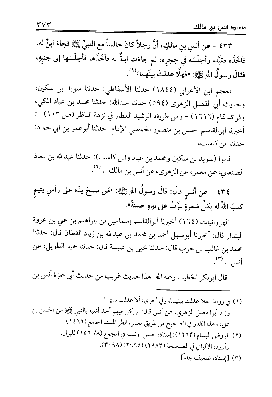433 - عن أنسِ بنِ مالكٍ، أنَّ رجلاً كانَ جالساً مع النبيِّ صلى الله عليه وسلم فجاءَ ابنٌ له، فأخَذَه فقبَّله وأجلَسَه في حِجرِه، ثم جاءَت ابنةٌ له فأخَذَها فأجلَسَها إلى جنبِهِ، فقالَ رسولُ اللهِ صلى الله عليه وسلم: «فهلَّا عدلتَ بينَهما» (¬1).