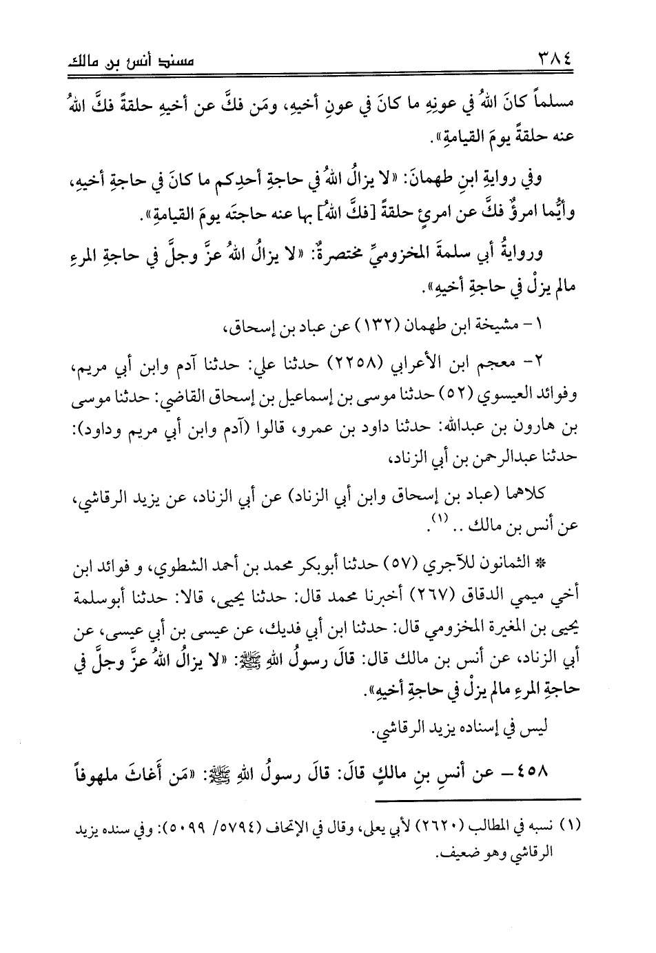 * الثمانون للآجري (57) حدثنا أبوبكر محمد بن أحمد الشطوي، و فوائد ابن أخي ميمي الدقاق (267) أخبرنا محمد قال: حدثنا يحيى، قالا: حدثنا أبوسلمة يحيى بن المغيرة المخزومي قال: حدثنا ابن أبي فديك، عن عيسى بن أبي عيسى، عن أبي الزناد، عن أنس بن مالك قال: قالَ رسولُ اللهِ صلى الله عليه وسلم: «لا يزالُ اللهُ عزَّ وجلَّ في حاجةِ المرءِ مالم يزلْ في حاجةِ أخيهِ».