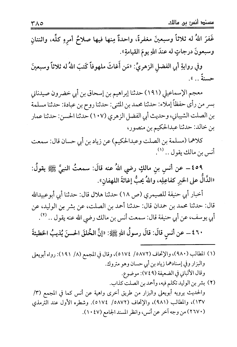 أخبار أبي حنيفة للصيمري (ص 18) حدثنا هلال قال: حدثنا أبي أبوعبيدالله قال: حدثنا محمد بن حمدان قال: حدثنا أحمد بن الصلت، عن بشر بن الوليد، عن أبي يوسف، عن أبي حنيفة قال: سمعت أنس بن مالك رضي الله عنه يقول .. (¬2).