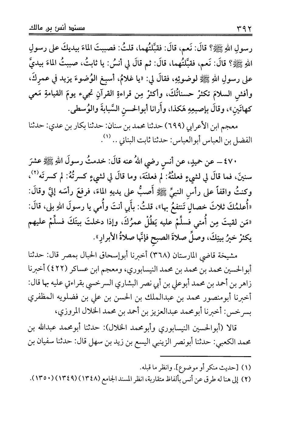 470 - عن حميدٍ، عن أنسٍ رضي اللهُ عنه قالَ: خدمتُ رسولَ اللهِ صلى الله عليه وسلم عشرَ سنينَ، فما قالَ لي لشيءٍ فعلتُهُ: لم فعلتَهَ، وما قالَ لي لشيءٍ كسرتُهُ: لم كسرتَه (¬2)، وكنتُ واقفاً على رأسِ النبيِّ صلى الله عليه وسلم أَصبُّ على يديهِ الماءَ، فرفعَ رأسَه إليَّ وقالَ: «أُعلمُكَ ثلاثَ خصالٍ تَنتفعُ بها»، قلتُ: بأَبي أنتَ وأُمي يا رسولَ اللهِ بلى، قالَ: «مَن لقيتَ مِن أُمتي فسلِّمْ عليه يَطُلْ عمرُكَ، وإذا دخلتَ بيتَكَ فسلِّمْ عليهم يكثرْ خيرُ بيتِكَ، وصلِّ صلاةَ الصبحِ فإنَّها صلاةُ الأبرارِ».