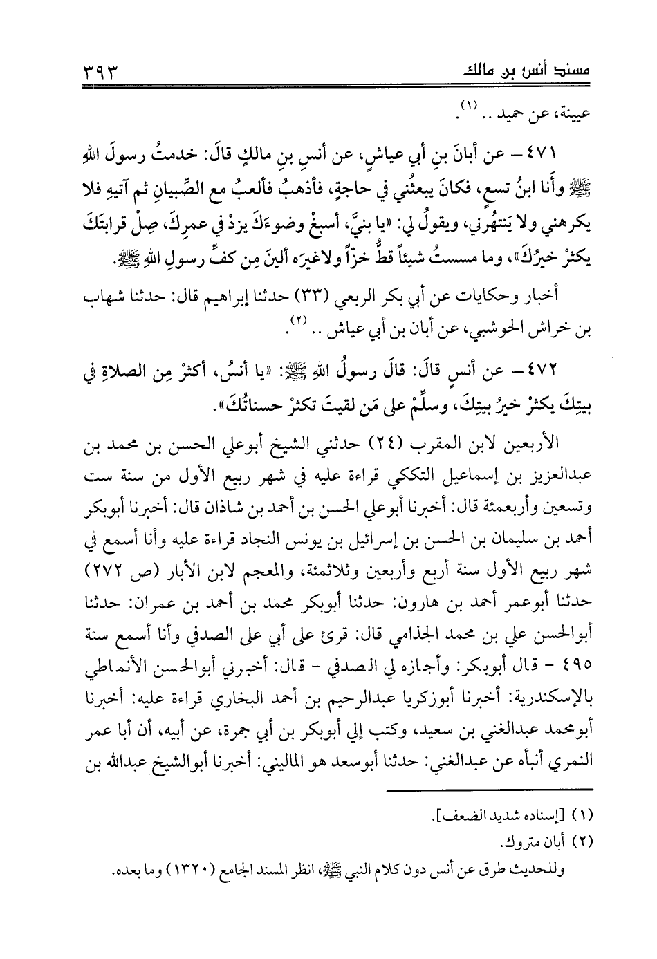471 - عن أبانَ بنِ أبي عياشٍ، عن أنسِ بنِ مالكٍ قالَ: خدمتُ رسولَ اللهِ صلى الله عليه وسلم وأَنا ابنُ تسعٍ، فكانَ يبعثُني في حاجةٍ، فأذهبُ فألعبُ مع الصِّبيانِ ثم آتيهِ فلا يكرهني ولا يَنتهُرني، ويقولُ لي: «يا بنيَّ، أسبغْ وضوءَكَ يزدْ في عمرِكَ، صِلْ قرابتَكَ يكثرْ خيرُكَ»، وما مسستُ شيئاً قطُّ خزّاً ولاغيرَه ألينَ مِن كفِّ رسولِ اللهِ صلى الله عليه وسلم.