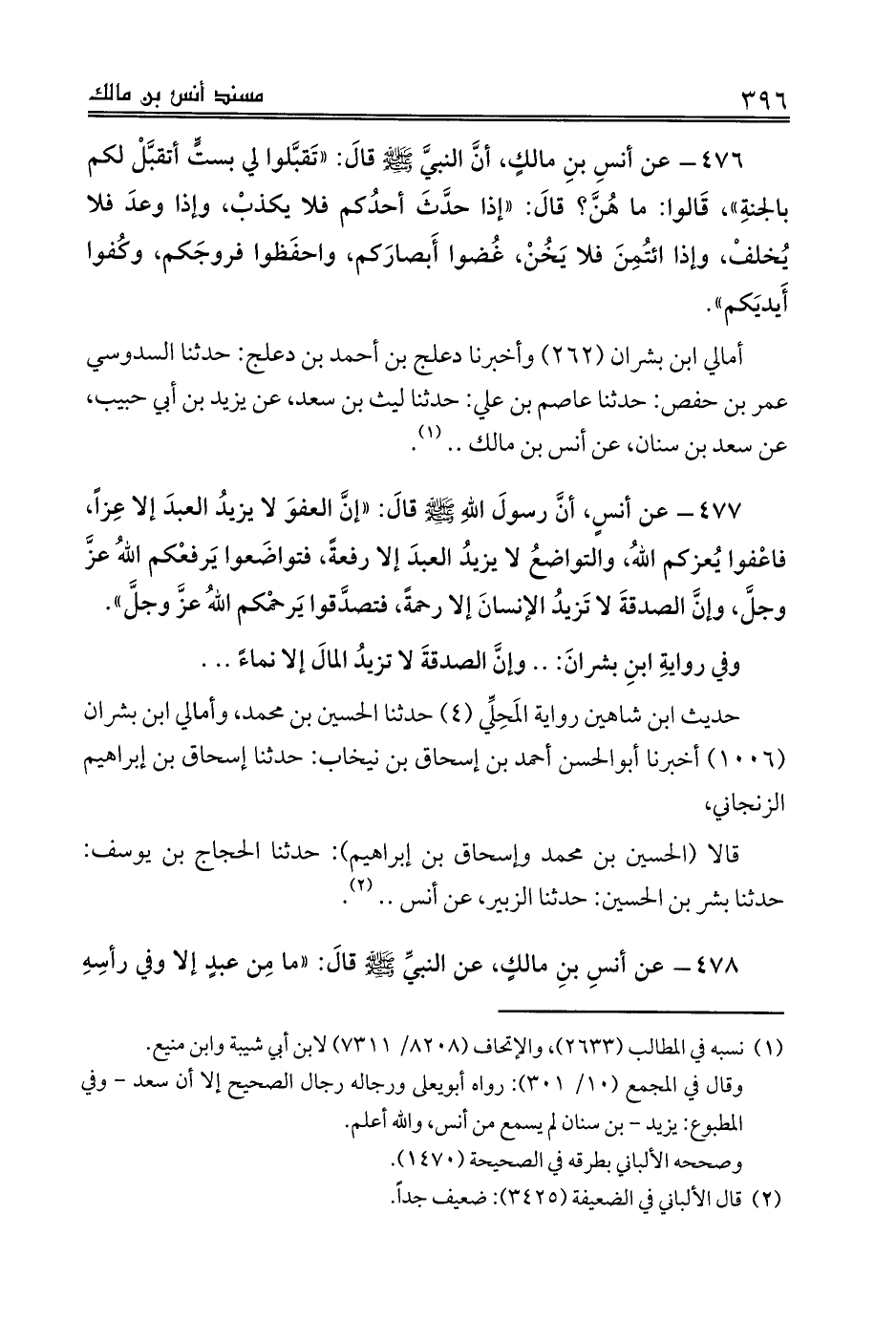477 - عن أنسٍ، أنَّ رسولَ اللهِ صلى الله عليه وسلم قالَ: «إنَّ العفوَ لا يزيدُ العبدَ إلا عِزاً، فاعْفوا يُعزكم اللهُ، والتواضعُ لا يزيدُ العبدَ إلا رفعةً، فتواضَعوا يَرفعْكم اللهُ عزَّ وجلَّ، وإنَّ الصدقةَ لا تَزيدُ الإنسانَ إلا رحمةً، فتصدَّقوا يَرحمْكم اللهُ عزَّ وجلَّ».