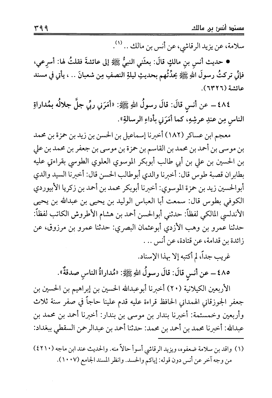 معجم ابن عساكر (182) أخبرنا إسماعيل بن الحسن بن زيد بن حمزة بن محمد بن موسى بن أحمد بن محمد بن القاسم بن حمزة بن موسى بن جعفر بن محمد بن علي بن الحسين بن علي بن أبي طالب أبوبكر الموسوي العلوي الطوسي بقراءتي عليه بطابران قصبة طوس قال: أخبرنا والدي أبوطالب الحسن قال: أخبرنا السيد والدي أبوالحسين زيد بن حمزة الموسوي: أخبرنا أبوبكر محمد بن أحمد بن زكريا الأبيوردي الكوفي بطوس قال: سمعت أبا العباس الوليد بن يحيى بن عبدالله بن يحيى الأندلسي المالكي لفظاً: حدثني أبوالحسن أحمد بن هشام الأطروش الكاتب لفظاً: حدثنا عمرو بن وهب الأزدي أبوعثمان البصري: حدثنا عمرو بن مرزوق، عن زائدة بن قدامة، عن قتادة، عن أنس .. .