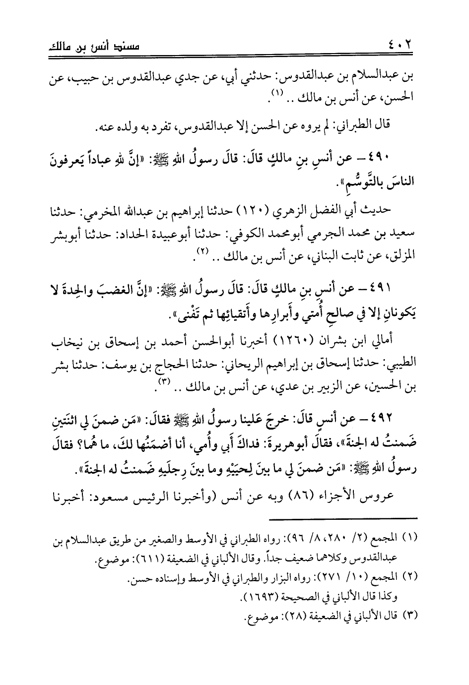 بن عبدالسلام بن عبدالقدوس: حدثني أبي، عن جدي عبدالقدوس بن حبيب، عن الحسن، عن أنس بن مالك .. (¬1).