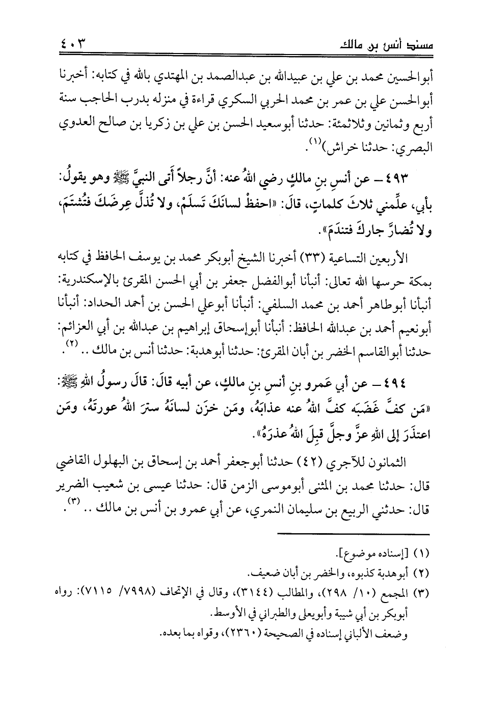 494 - عن أبي عَمرو بنِ أنسِ بنِ مالكٍ، عن أبيه قالَ: قالَ رسولُ اللهِ صلى الله عليه وسلم: «مَن كفَّ غَضَبَه كفَّ اللهُ عنه عذابَهُ، ومَن خزَن لسانَهُ سترَ اللهُ عورتَهُ، ومَن اعتذَرَ إلى اللهِ عزَّ وجلَّ قبِلَ اللهُ عذرَهُ».