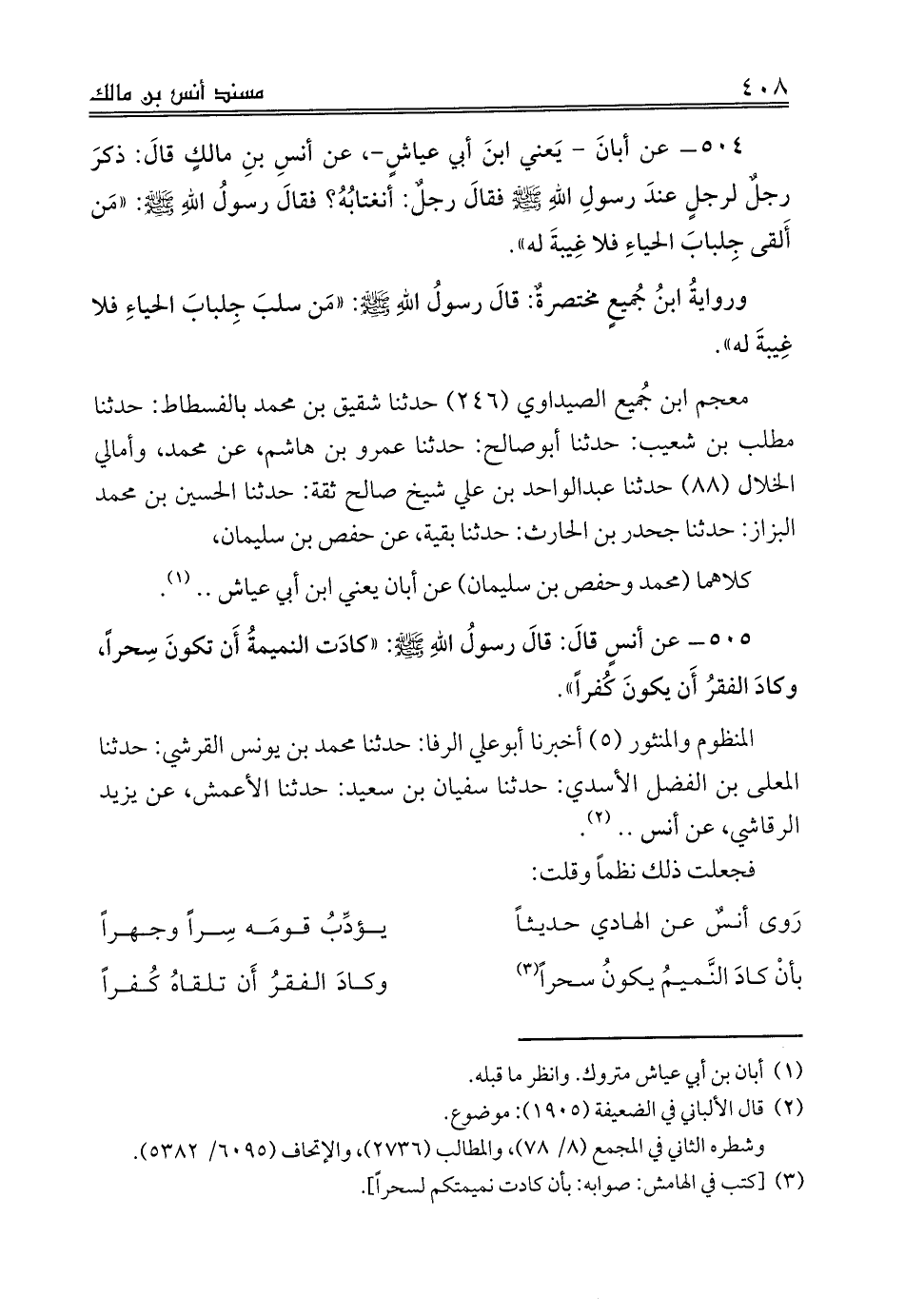 504 - عن أبانَ - يَعني ابنَ أبي عياشٍ-، عن أنسِ بنِ مالكٍ قالَ: ذكرَ رجلٌ لرجلٍ عندَ رسولِ اللهِ صلى الله عليه وسلم فقالَ رجلٌ: أنغتابُهُ؟ فقالَ رسولُ اللهِ صلى الله عليه وسلم: «مَن أَلقى جِلبابَ الحياءِ فلا غِيبةَ له».