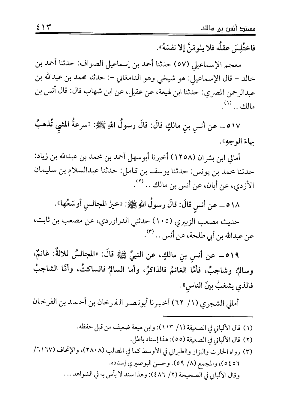 معجم الإسماعيلي (57) حدثنا أحمد بن إسماعيل الصواف: حدثنا أحمد بن خالد - قال الإسماعيلي: هو شيخي وهو الدامغاني -: حدثنا محمد بن عبدالله بن عبدالرحمن المصري: حدثنا ابن لهيعة، عن عقيل، عن ابن شهاب قال: قال أنس بن مالك .. (¬1).
