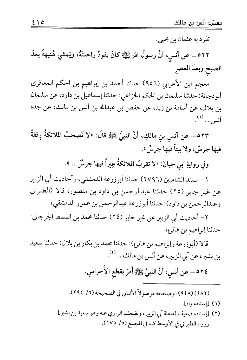 523 - عن أنسِ بنِ مالكٍ، أنَّ النبيَّ صلى الله عليه وسلم قالَ: «لا تَصحبُ الملائكةُ رِفقةً فيها جرسٌ، ولا بيتاً فيها جرسٌ».