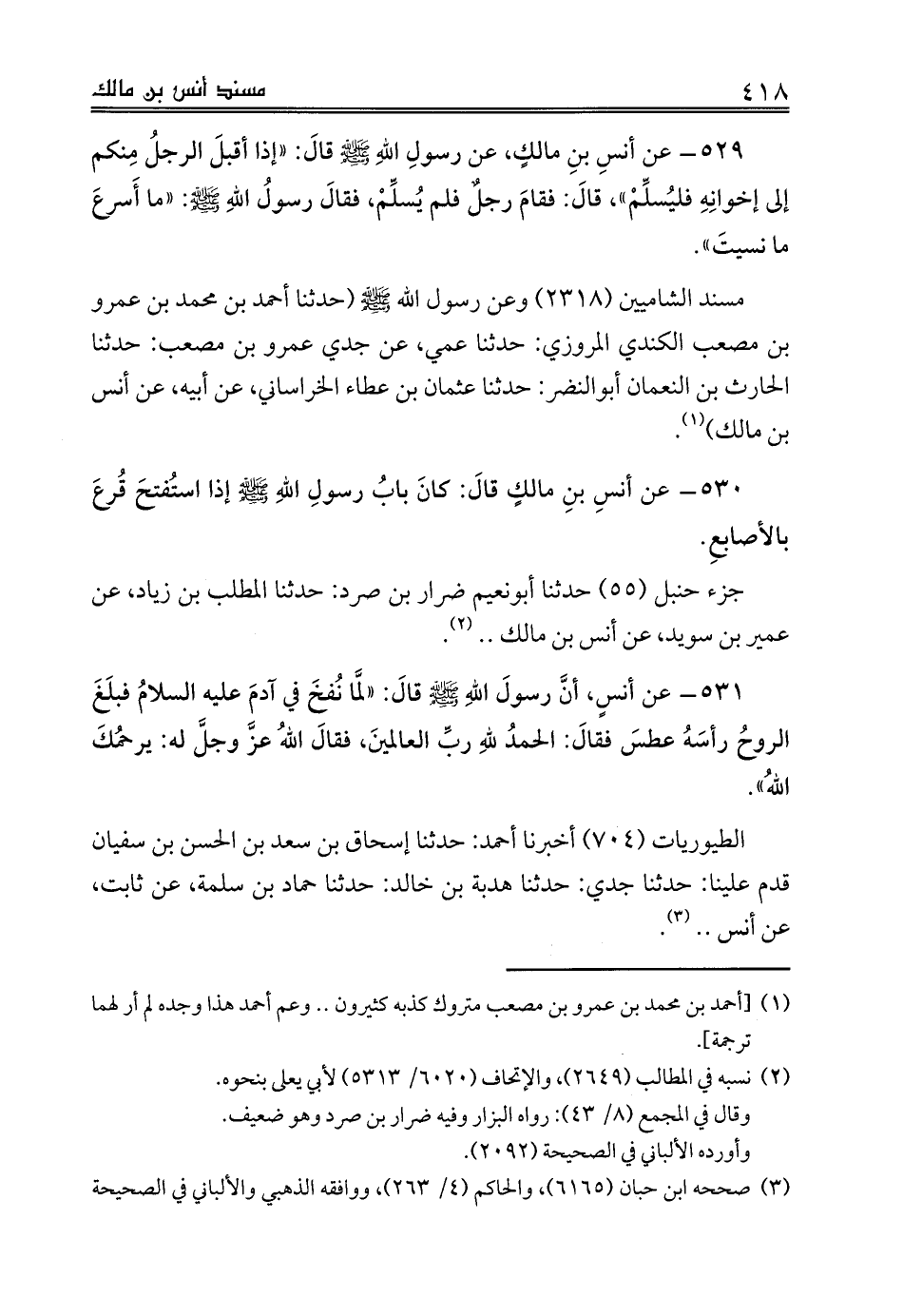 الطيوريات (704) أخبرنا أحمد: حدثنا إسحاق بن سعد بن الحسن بن سفيان قدم علينا: حدثنا جدي: حدثنا هدبة بن خالد: حدثنا حماد بن سلمة، عن ثابت، عن أنس .. (¬3).