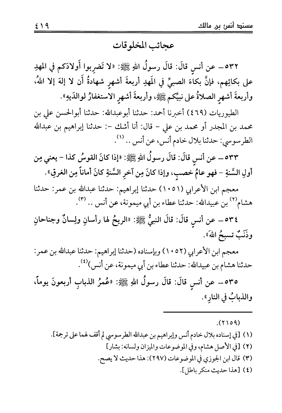الطيوريات (469) أخبرنا أحمد: حدثنا أبوعبدالله: حدثنا أبوالحسن علي بن محمد بن المجدر أو محمد بن علي - قال: أنا أشك -: حدثنا إبراهيم بن عبدالله الطرسوسي: حدثنا بلال خادم أنس، عن أنس .. (¬1).