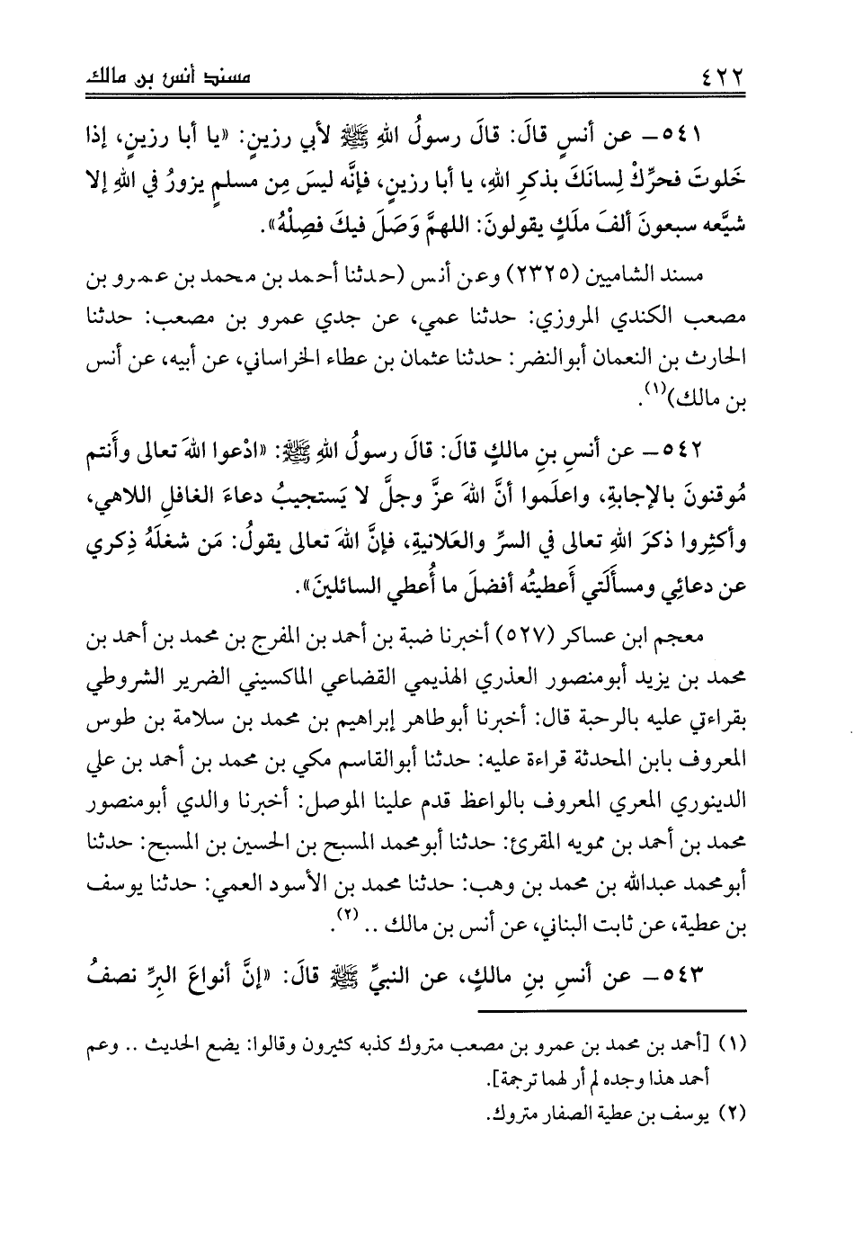 معجم ابن عساكر (527) أخبرنا ضبة بن أحمد بن المفرج بن محمد بن أحمد بن محمد بن يزيد أبومنصور العذري الهذيمي القضاعي الماكسيني الضرير الشروطي بقراءتي عليه بالرحبة قال: أخبرنا أبوطاهر إبراهيم بن محمد بن سلامة بن طوس المعروف بابن المحدثة قراءة عليه: حدثنا أبوالقاسم مكي بن محمد بن أحمد بن علي الدينوري المعري المعروف بالواعظ قدم علينا الموصل: أخبرنا والدي أبومنصور محمد بن أحمد بن ممويه المقرئ: حدثنا أبومحمد المسبح بن الحسين بن المسبح: حدثنا أبومحمد عبدالله بن محمد بن وهب: حدثنا محمد بن الأسود العمي: حدثنا يوسف بن عطية، عن ثابت البناني، عن أنس بن مالك .. (¬2).