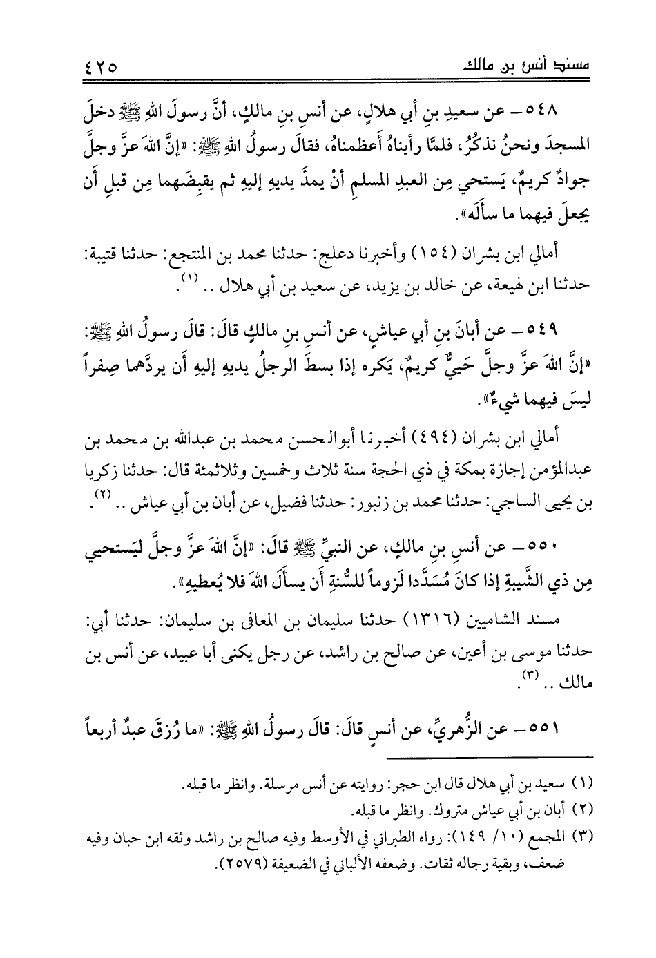 549 - عن أبانَ بنِ أبي عياشٍ، عن أنسِ بنِ مالكٍ قالَ: قالَ رسولُ اللهِ صلى الله عليه وسلم: «إنَّ اللهَ عزَّ وجلَّ حَييٌّ كريمٌ، يَكره إذا بسطَ الرجلُ يديهِ إليهِ أَن يردَّهما صِفراً ليسَ فيهما شيءٌ».