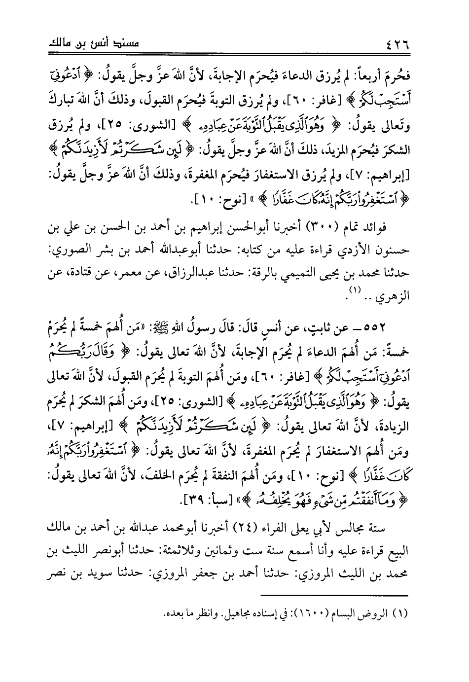 ستة مجالس لأبي يعلى الفراء (24) أخبرنا أبومحمد عبدالله بن أحمد بن مالك البيع قراءة عليه وأنا أسمع سنة ست وثمانين وثلاثمئة: حدثنا أبونصر الليث بن محمد بن الليث المروزي: حدثنا أحمد بن جعفر المروزي: حدثنا سويد بن نصر