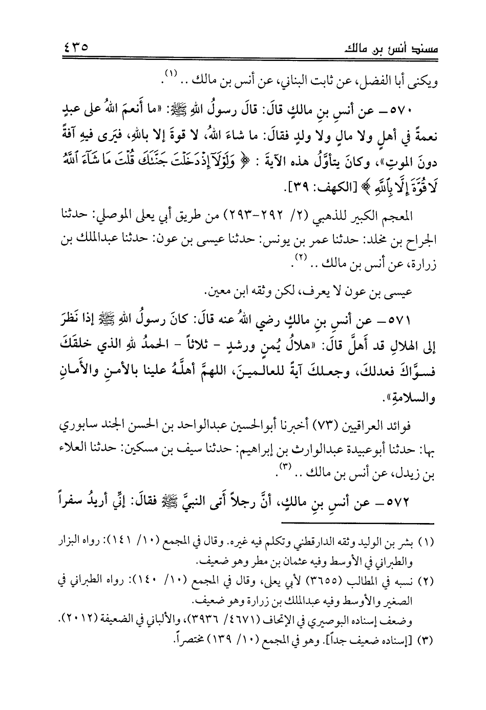المعجم الكبير للذهبي (2/ 292 - 293) من طريق أبي يعلى الموصلي: حدثنا الجراح بن مخلد: حدثنا عمر بن يونس: حدثنا عيسى بن عون: حدثنا عبدالملك بن زرارة، عن أنس بن مالك .. (¬2).