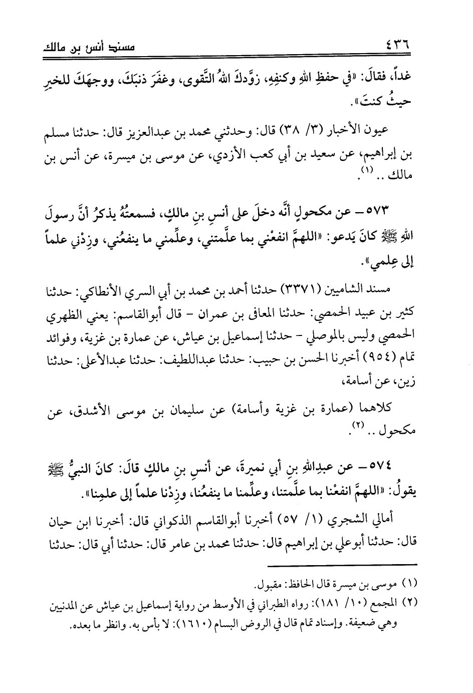 عيون الأخبار (3/ 38) قال: وحدثني محمد بن عبدالعزيز قال: حدثنا مسلم بن إبراهيم، عن سعيد بن أبي كعب الأزدي، عن موسى بن ميسرة، عن أنس بن مالك .. (¬1).