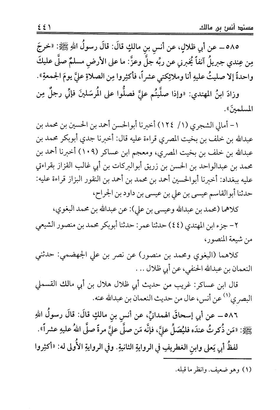 585 - عن أبي ظلالٍ، عن أنسِ بنِ مالكٍ قالَ: قالَ رسولُ اللهِ صلى الله عليه وسلم: «خرجَ مِن عِندي جبريلُ آنفاً يُخبرني عن ربِّه جلَّ وعزَّ: ما على الأرضِ مسلمٌ صلَّى عليكَ واحدةً إلا صليتُ عليهِ أنا وملائِكتي عشراً، فأكثِروا مِن الصلاةِ عليَّ يومَ الجمعةِ».