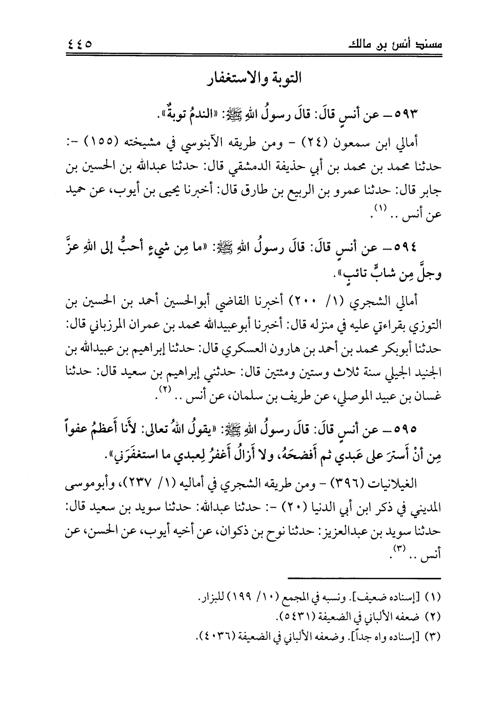 593 - عن أنسٍ قالَ: قالَ رسولُ اللهِ صلى الله عليه وسلم: «الندمُ توبةٌ».