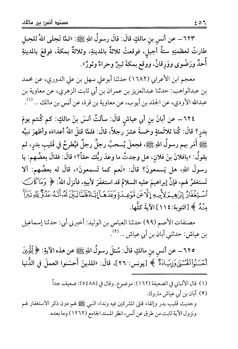 624 - عن أبانَ بنِ أبي عياشٍ قالَ: سألتُ أنسَ بنَ مالكٍ: كم كُنتم يومَ بدرٍ؟ قالَ: كُنا ثلاثَمئةٍ وخمسةَ عشرَ رجلاً، قالَ: فلمَّا قتلَ اللهُ أعداءَه وأظهرَ نبيَّه صلى الله عليه وسلم أَمَر بهم رسولُ اللهِ صلى الله عليه وسلم، فجعلَ يُسحبُ رجلٌ رجلٌ فيُطرحُ في قَليبِ بدرٍ، ثم يقولُ: «يافلانَ بنَ فلانٍ، هل وجدتَّ ما وعدَ ربُّك حقاً؟» قالَ: فقالَ بعضُهم: يا رسولَ اللهِ، هل يَسمعونَ؟ قالَ: «نَعم كما تَسمعونَ»، قالَ له بعضُهم: ألا تَستغفرُ لهم، فإنَّ إبراهيمَ عليه السلامُ قد استغفَرَ لأبيهِ، فأنزلَ اللهُ: {وَمَا كَانَ اسْتِغْفَارُ إِبْرَاهِيمَ لِأَبِيهِ إِلَّا عَنْ مَوْعِدَةٍ وَعَدَهَا إِيَّاهُ فَلَمَّا تَبَيَّنَ لَهُ أَنَّهُ عَدُوٌّ لِلَّهِ تَبَرَّأَ مِنْهُ} [التوبة:114] الآيةَ كلَّها.
