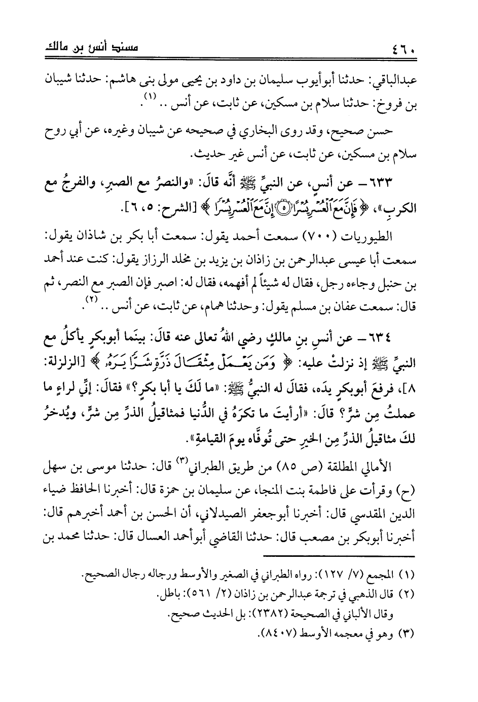 633 - عن أنسٍ، عن النبيِّ صلى الله عليه وسلم أنَّه قالَ: «والنصرُ مع الصبرِ، والفرجُ مع الكربِ»، {فَإِنَّ مَعَ الْعُسْرِ يُسْرًا (5) إِنَّ مَعَ الْعُسْرِ يُسْرًا} [الشرح: 5، 6].