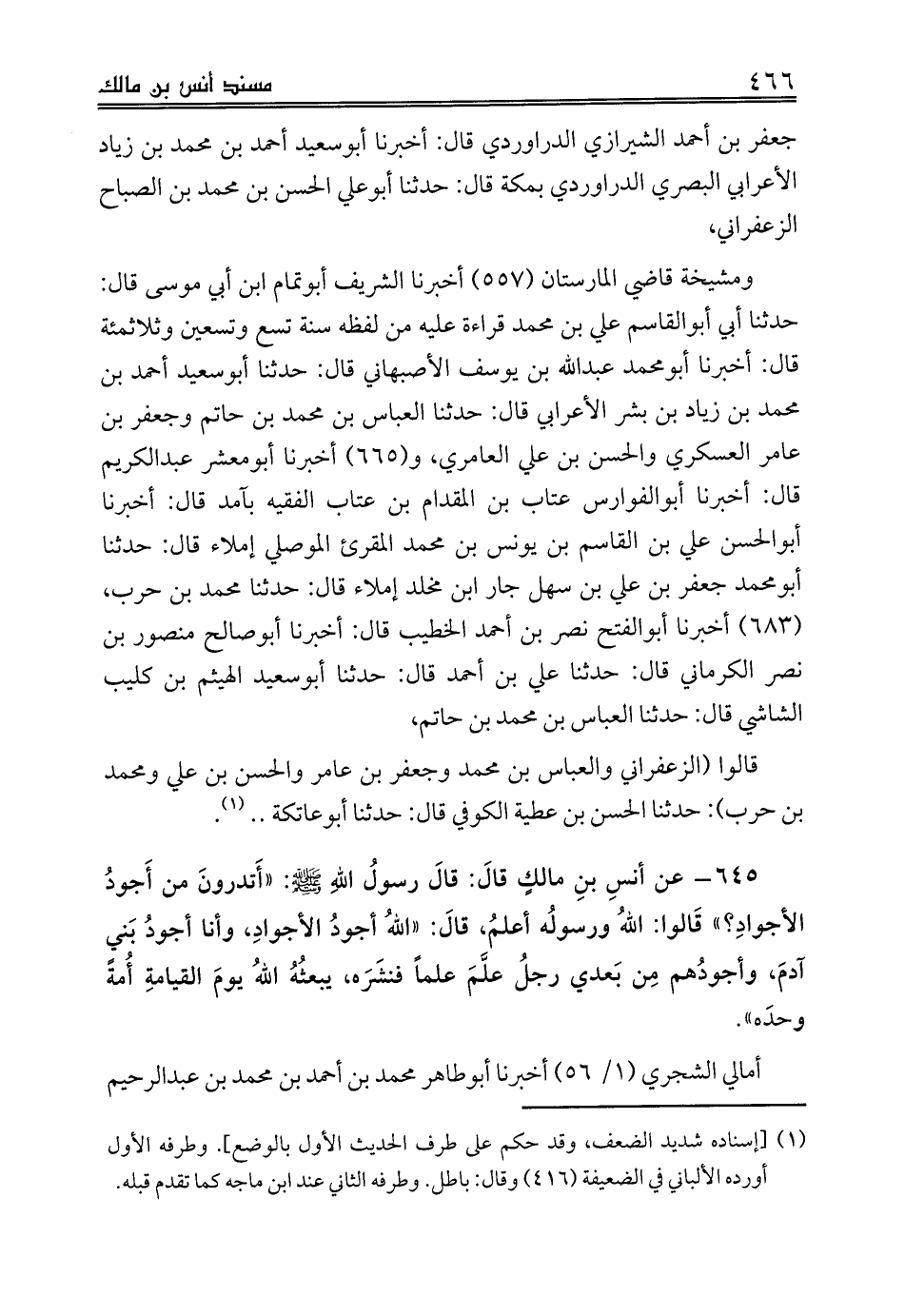 645 - عن أنسِ بنِ مالكٍ قالَ: قالَ رسولُ اللهِ صلى الله عليه وسلم: «أَتدرونَ من أَجودُ الأجوادِ؟» قَالوا: اللهُ ورسولُه أعلمُ، قالَ: «اللهُ أجودُ الأجوادِ، وأنا أجودُ بَني آدمَ، وأجودُهم مِن بَعدي رجلُ علَّمَ علماً فنشَرَه، يبعثُهُ اللهُ يومَ القيامةِ أُمةً وحدَه».
