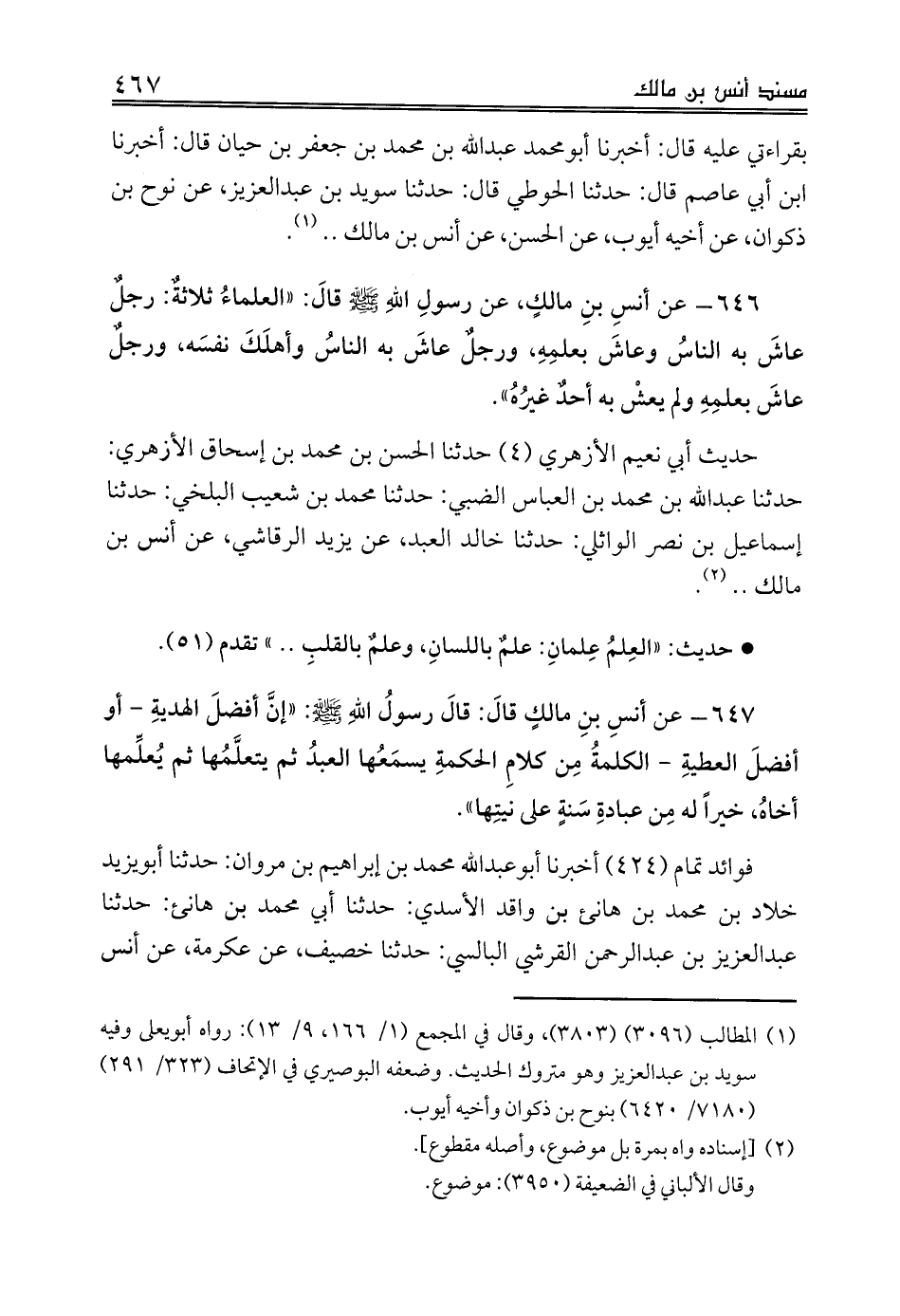 646 - عن أنسِ بنِ مالكٍ، عن رسول اللهِ صلى الله عليه وسلم قالَ: «العلماءُ ثلاثةٌ: رجلٌ عاشَ به الناسُ وعاشَ بعلمِهِ، ورجلٌ عاشَ به الناسُ وأهلَكَ نفسَه، ورجلٌ عاشَ بعلمِهِ ولم يعشْ به أحدٌ غيرُهُ».