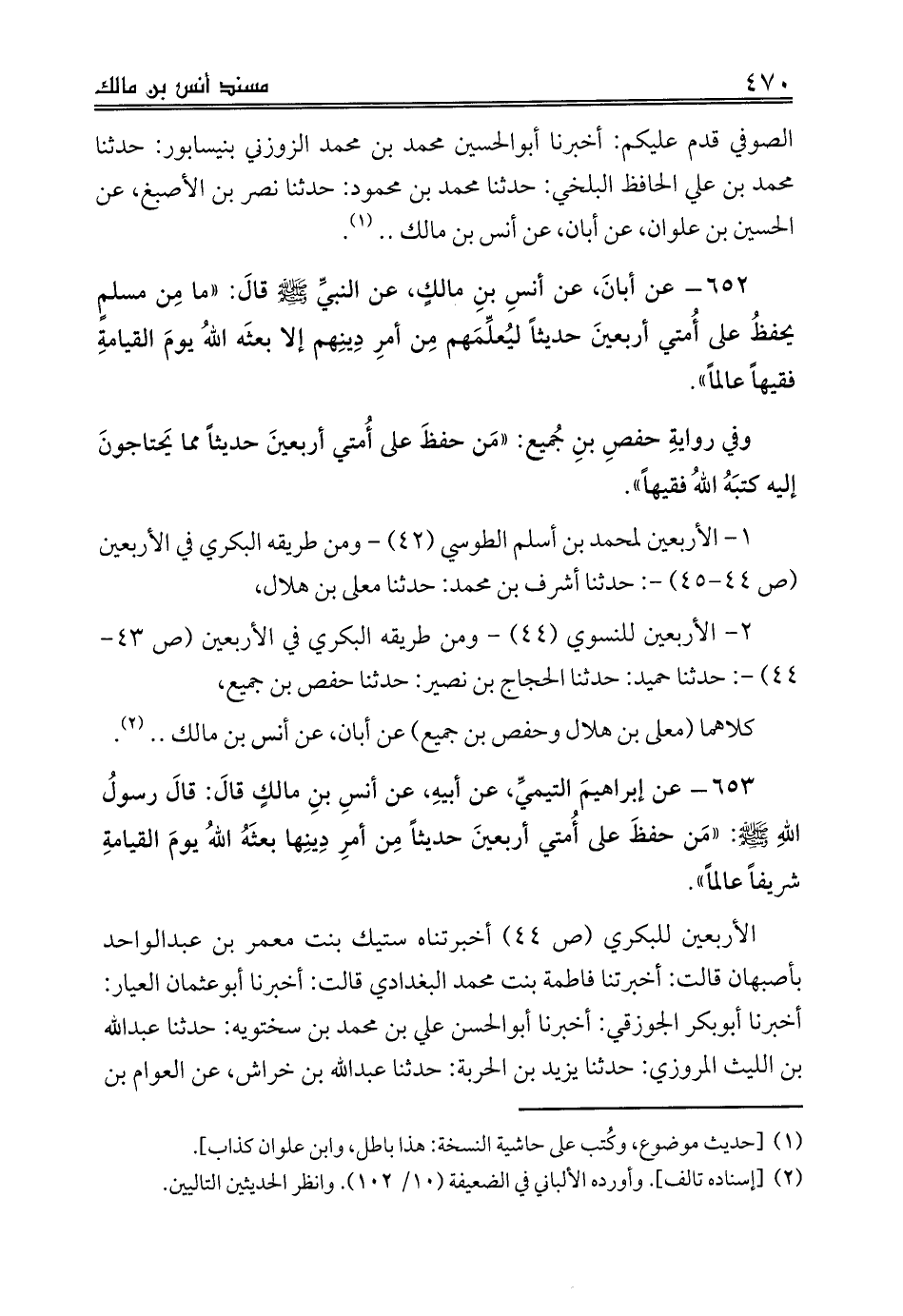 الصوفي قدم عليكم: أخبرنا أبوالحسين محمد بن محمد الزوزني بنيسابور: حدثنا محمد بن علي الحافظ البلخي: حدثنا محمد بن محمود: حدثنا نصر بن الأصبغ، عن الحسين بن علوان، عن أبان، عن أنس بن مالك .. (¬1).