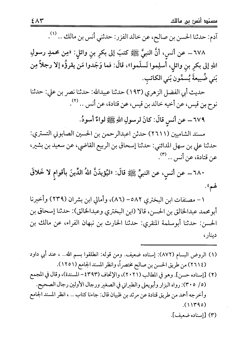 (¬2) [إسناده حسن]. وهو في المطالب (2021)، والإتحاف (4393 - المسندة)، وقال في المجمع (5/ 305): رواه البزار وأبويعلى والطبراني في الصغير ورجال الأولين رجال الصحيح. وأخرجه أحمد من طريق قتادة عن مرثد بن ظبيان قال: جاءنا كتاب .. ، انظر المسند الجامع (11395).