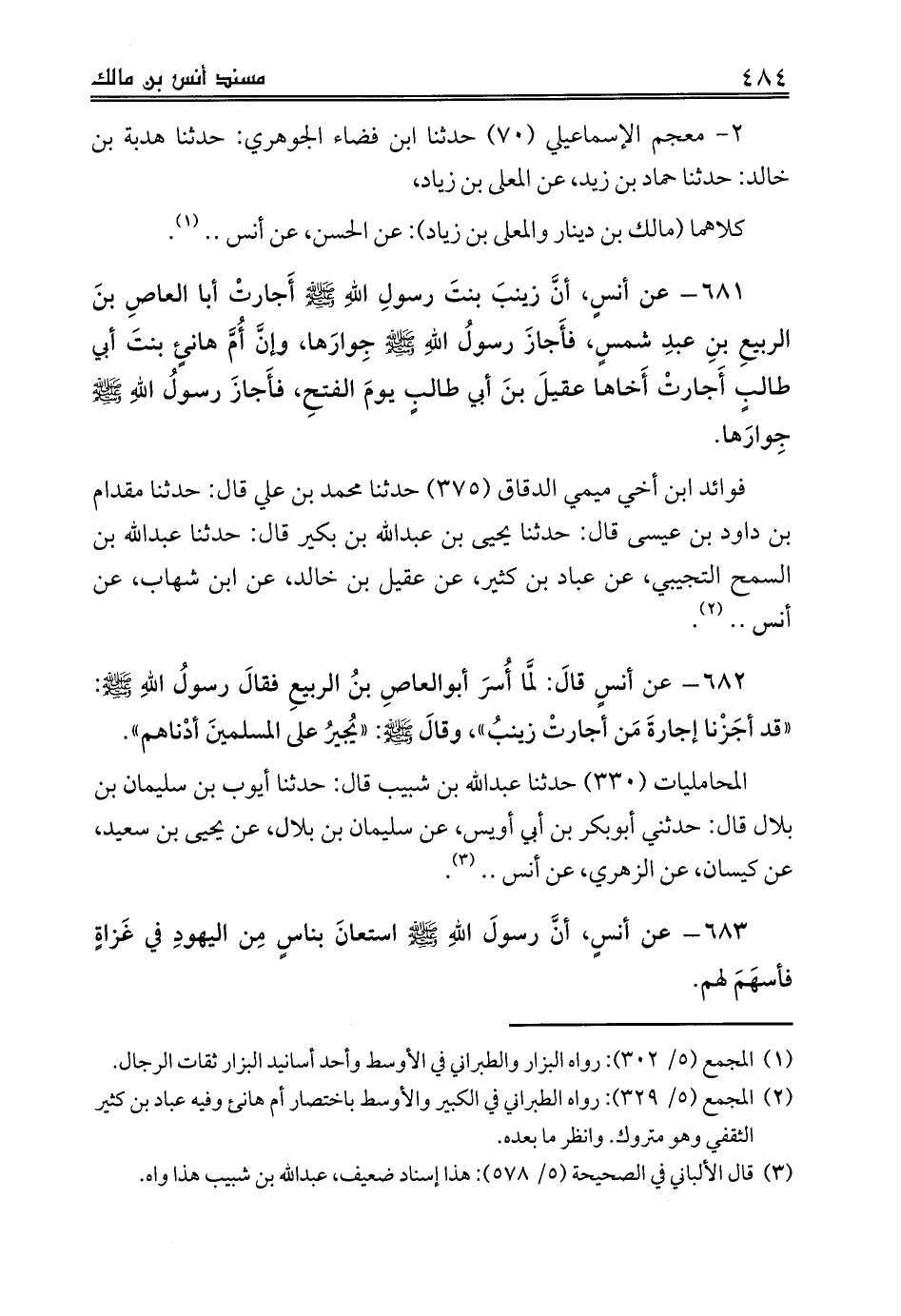 681 - عن أنسٍ، أنَّ زينبَ بنتَ رسولِ اللهِ صلى الله عليه وسلم أَجارتْ أبا العاصِ بنَ الربيعِ بنِ عبدِ شمسٍ، فأَجازَ رسولُ اللهِ صلى الله عليه وسلم جِوارَها، وإنَّ أُمَّ هانئٍ بنتَ أبي طالبٍ أَجارتْ أَخاها عقيلَ بنَ أبي طالبٍ يومَ الفتحِ، فأَجازَ رسولُ اللهِ صلى الله عليه وسلم جِوارَها.