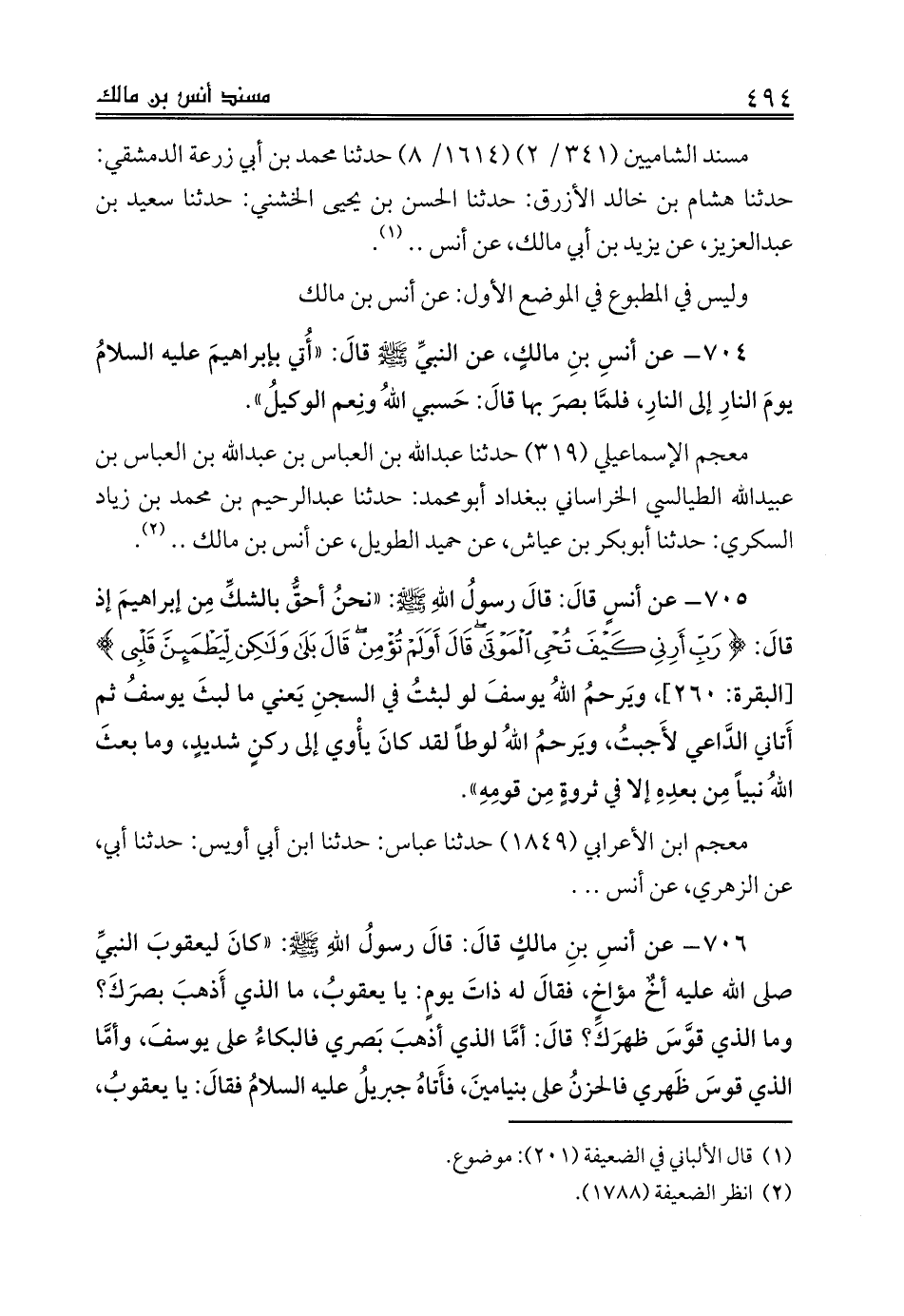 706 - عن أنسِ بنِ مالكٍ قالَ: قالَ رسولُ اللهِ صلى الله عليه وسلم: «كانَ ليعقوبَ النبيِّ صلى الله عليه أخٌ مؤاخٍ، فقالَ له ذاتَ يومٍ: يا يعقوبُ، ما الذي أَذهبَ بصرَكَ؟ وما الذي قوَّسَ ظهرَكَ؟ قالَ: أمَّا الذي أذهبَ بَصري فالبكاءُ على يوسفَ، وأمَّا الذي قوسَ ظَهري فالحزنُ على بنيامينَ، فأَتاهُ جبريلُ عليه السلامُ فقالَ: يا