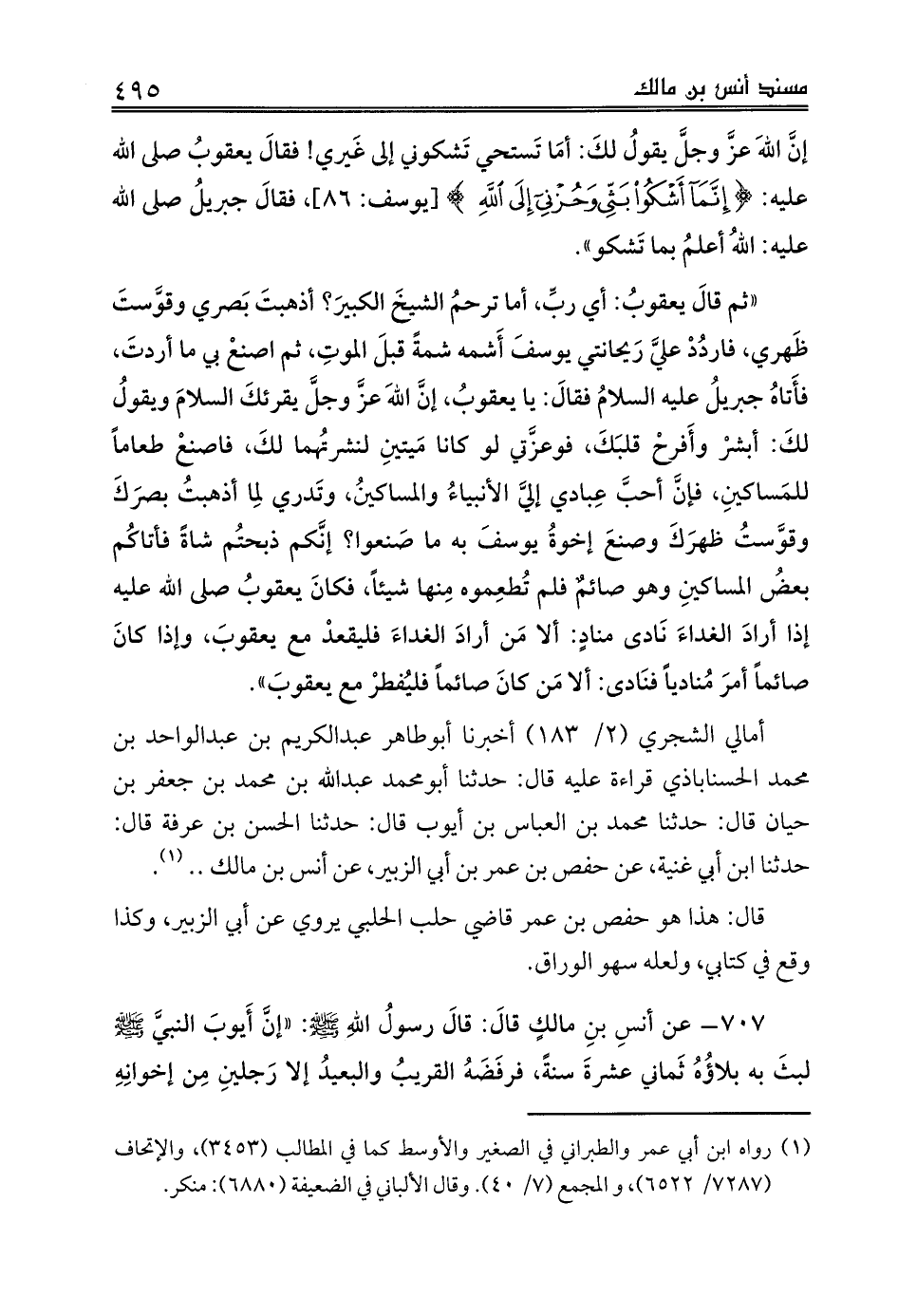 أمالي الشجري (2/ 183) أخبرنا أبوطاهر عبدالكريم بن عبدالواحد بن محمد الحسناباذي قراءة عليه قال: حدثنا أبومحمد عبدالله بن محمد بن جعفر بن حيان قال: حدثنا محمد بن العباس بن أيوب قال: حدثنا الحسن بن عرفة قال: حدثنا ابن أبي غنية، عن حفص بن عمر بن أبي الزبير، عن أنس بن مالك .. (¬1).