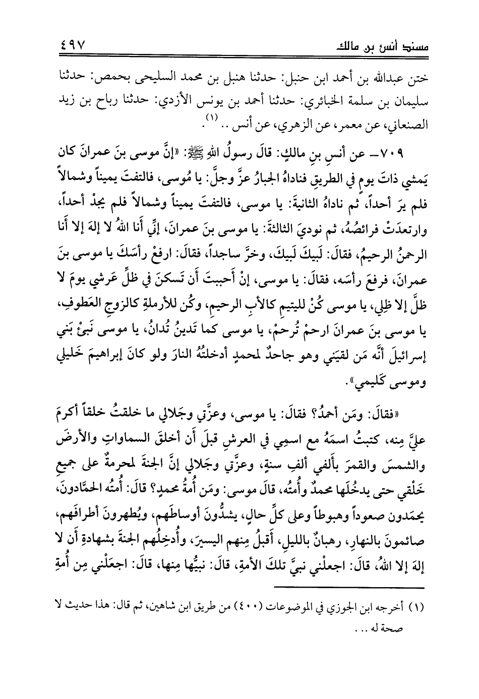 709 - عن أنسِ بنِ مالكٍ: قالَ رسولُ اللهِ صلى الله عليه وسلم: «إنَّ موسى بنَ عمرانَ كان يَمشي ذاتَ يومٍ في الطريقِ فناداهُ الجبارُ عزَّ وجلَّ: يا مُوسى، فالتفتَ يميناً وشمالاً فلم يرَ أحداً، ثم ناداهُ الثانيةَ: يا موسى، فالتفتَ يميناً وشمالاً فلم يجدْ أحداً، وارتعدَتْ فرائصُهُ، ثم نوديَ الثالثةَ: يا موسى بنَ عمرانَ، إنِّي أَنا اللهُ لا إلهَ إلا أَنا الرحمنُ الرحيمُ، فقالَ: لَبيكَ لَبيكَ، وخرَّ ساجداً، فقالَ: ارفعْ رأسَكَ يا موسى بنَ عمرانَ، فرفعَ رأسَه، فقالَ: يا موسى، إنْ أَحببتَ أَن تَسكنَ في ظلِّ عَرشي يومَ لا ظلَّ إلا ظِلي، يا موسى كُنْ لليتيمِ كالأبِ الرحيمِ، وكُن للأرملةِ كالزوجِ العَطوفِ، يا موسى بنَ عمرانَ ارحمْ تُرحمْ، يا موسى كما تَدينُ تُدانُ، يا موسى نَبئْ بَني إسرائيلَ أنَّه مَن لقيَني وهو جاحدٌ لمحمدٍ أدخلتُهُ النارَ ولو كانَ إبراهيمَ خَليلي وموسى كَليمي».