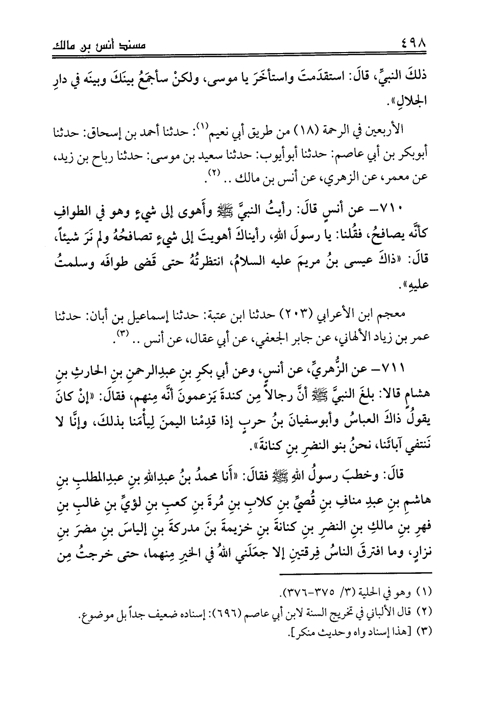 710 - عن أنسٍ قالَ: رأيتُ النبيَّ صلى الله عليه وسلم وأَهوى إلى شيءٍ وهو في الطوافِ كأنَّه يصافحُ، فقُلنا: يا رسولَ اللهِ، رأيناكَ أهويتَ إلى شيءٍ تصافحُهُ ولم نَرَ شيئاً، قالَ: «ذاكَ عيسى بنُ مريمَ عليه السلامُ، انتظرتُهُ حتى قَضى طوافَه وسلمتُ عليهِ».